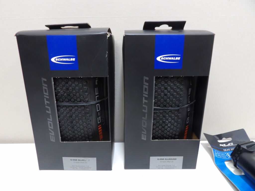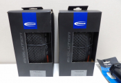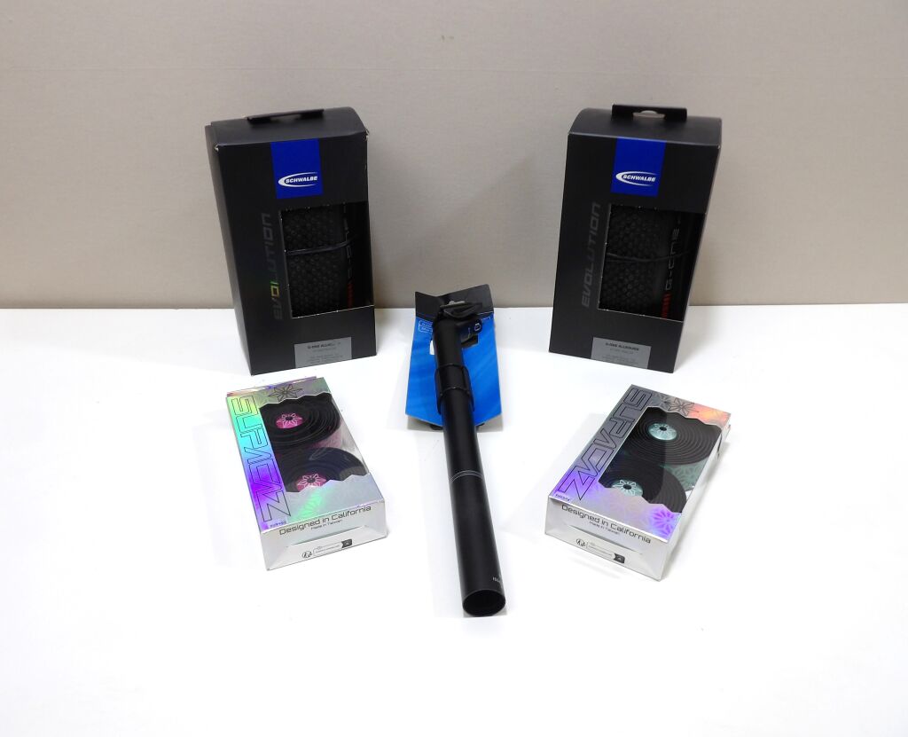 CYCLISME - Lot de 5 articles NEUFS - 2x Pneus Scwalbe modèle G-One allround + 2x ruban Super sticky kush ( rose + vert) + Tige de selle en alu noire XLC