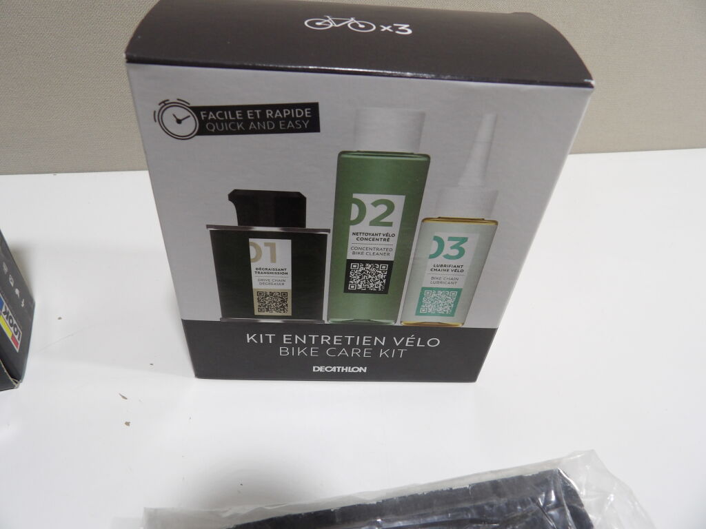 CYCLISME : Lot de x5 articles neufs pour etretenir son vélo : Kit entretien vélo, XLC et Decathlon : outil multifonctionnel; et on y inclut des pédales X-TRACK de LOOK - MTB Clipless Pedal, neuf.