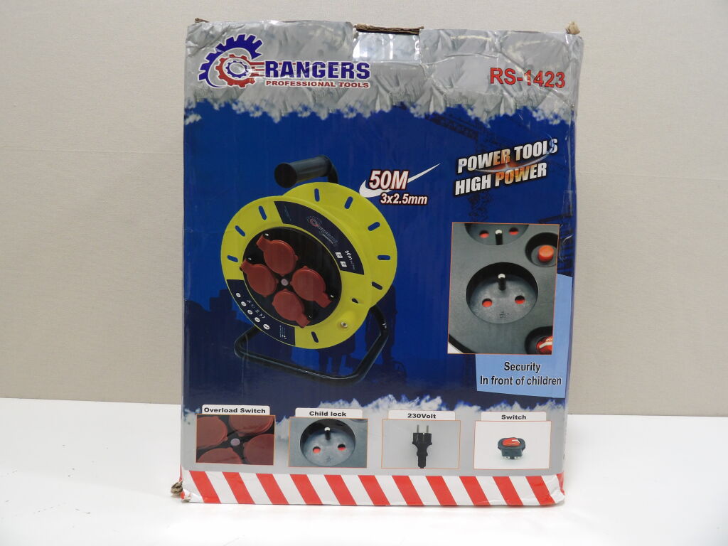 Enrouleur RANGERS RS-1423 - 50M 3x2,5MM. Etat neuf (boite très abimée). Avec x4 de 230V.