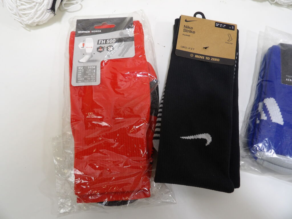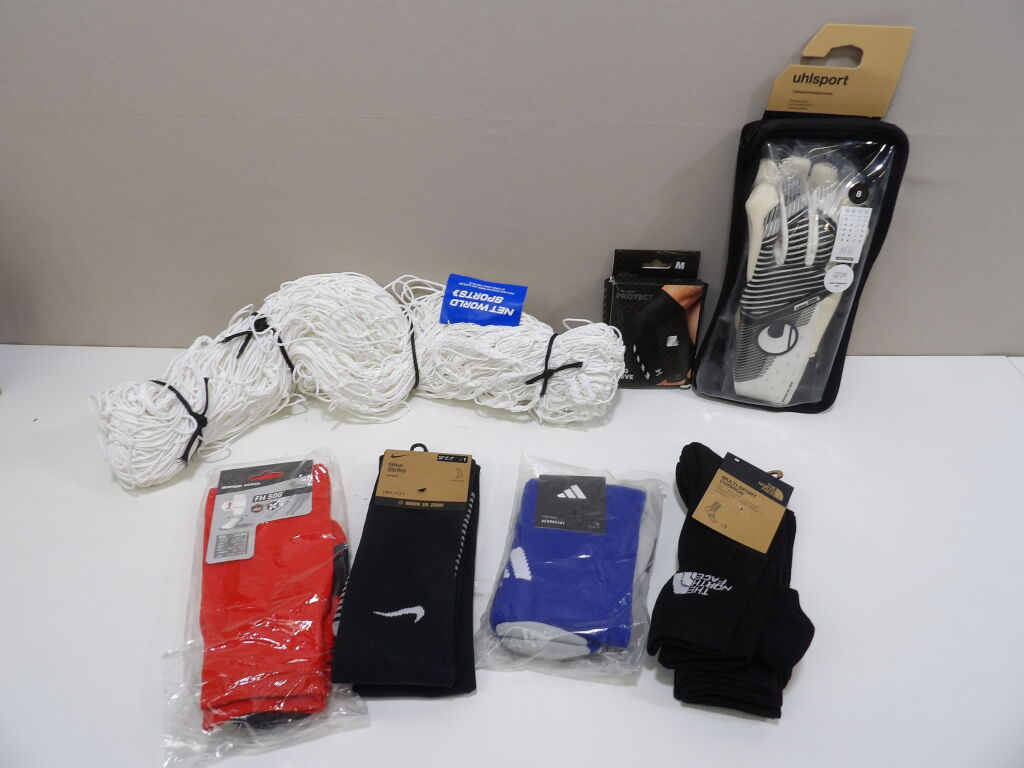 FOOTBALL - Lot de x7 articles neufs : Filet pour but, Gants uhlsport en T8, Hummel protection coude M, x3 paires de chaussettes de football (Nike, Decathlon et Adidas); et x1 pack de 3 paires de chaussettes multi sports THE NORTH FACE.