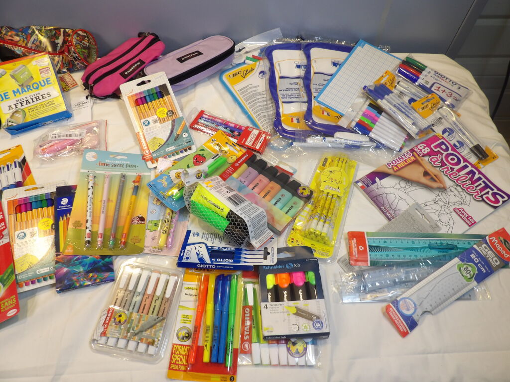 FOURNITURE ECOLE 30 Pcs : Surligneur - Règles - Velleda - CrayonsTrousse EASTPAK - Sac - Colle etc....