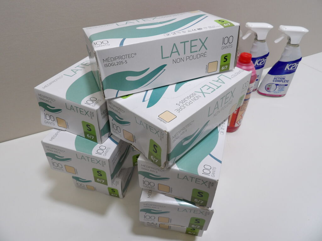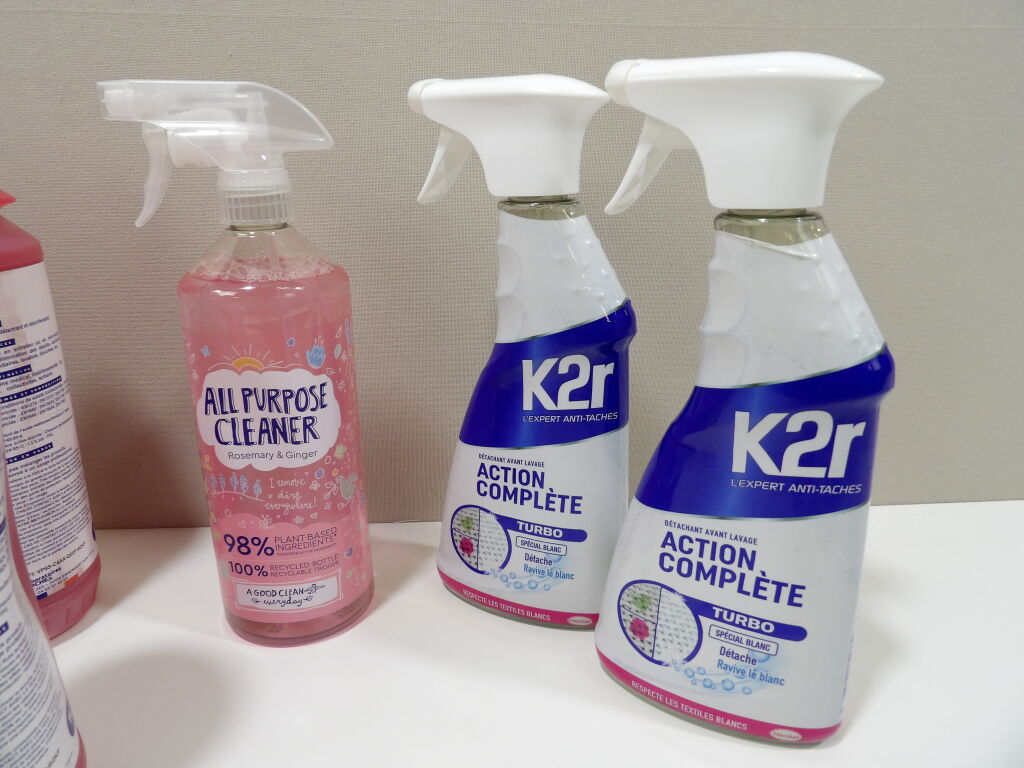 Lot de PRODUITS MENAGERS : x2 Pulvérisateurs Kr - Détachant avant lavage; x1 Nettoyant tout usage, x4 Gel Détartrant Nettoyant Désinfectant Désodorisant, et des gants en latex (pour bien se protéger pour faire le ménage?)
