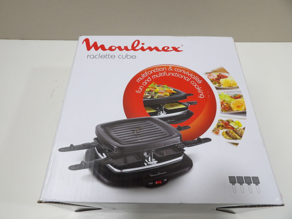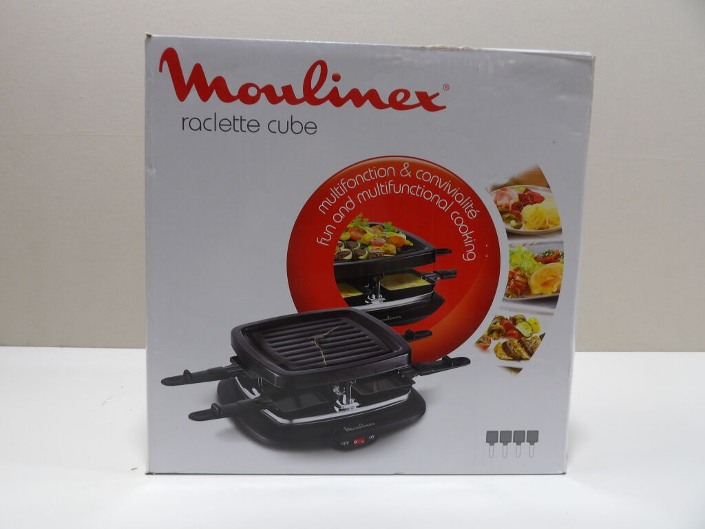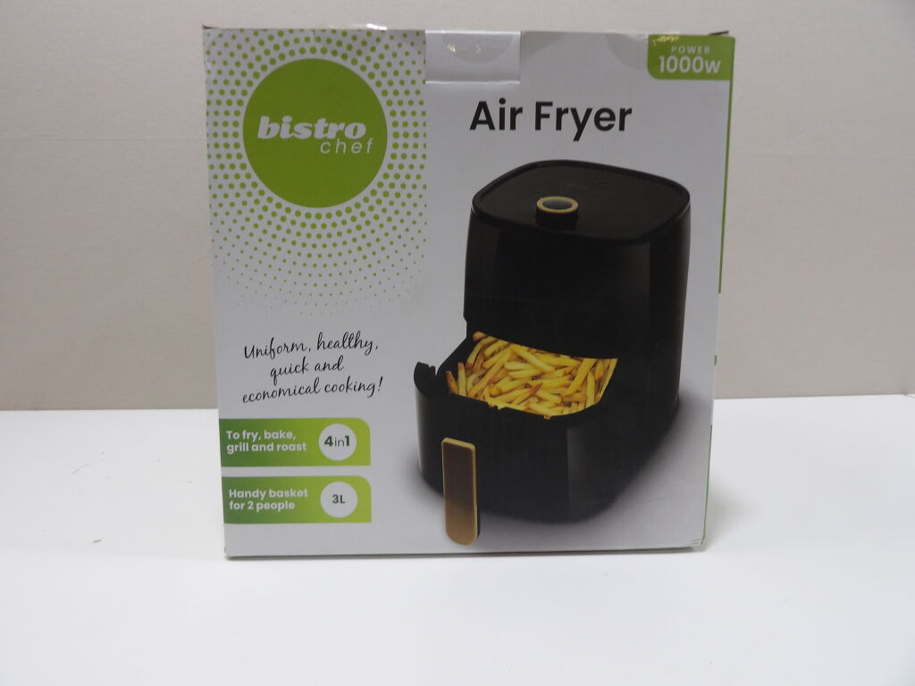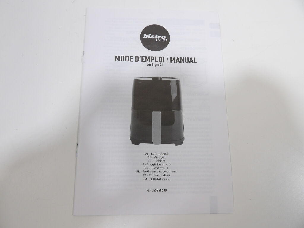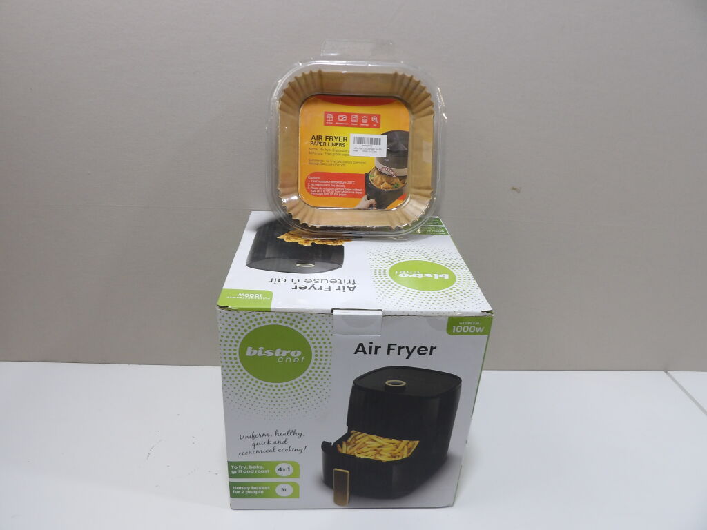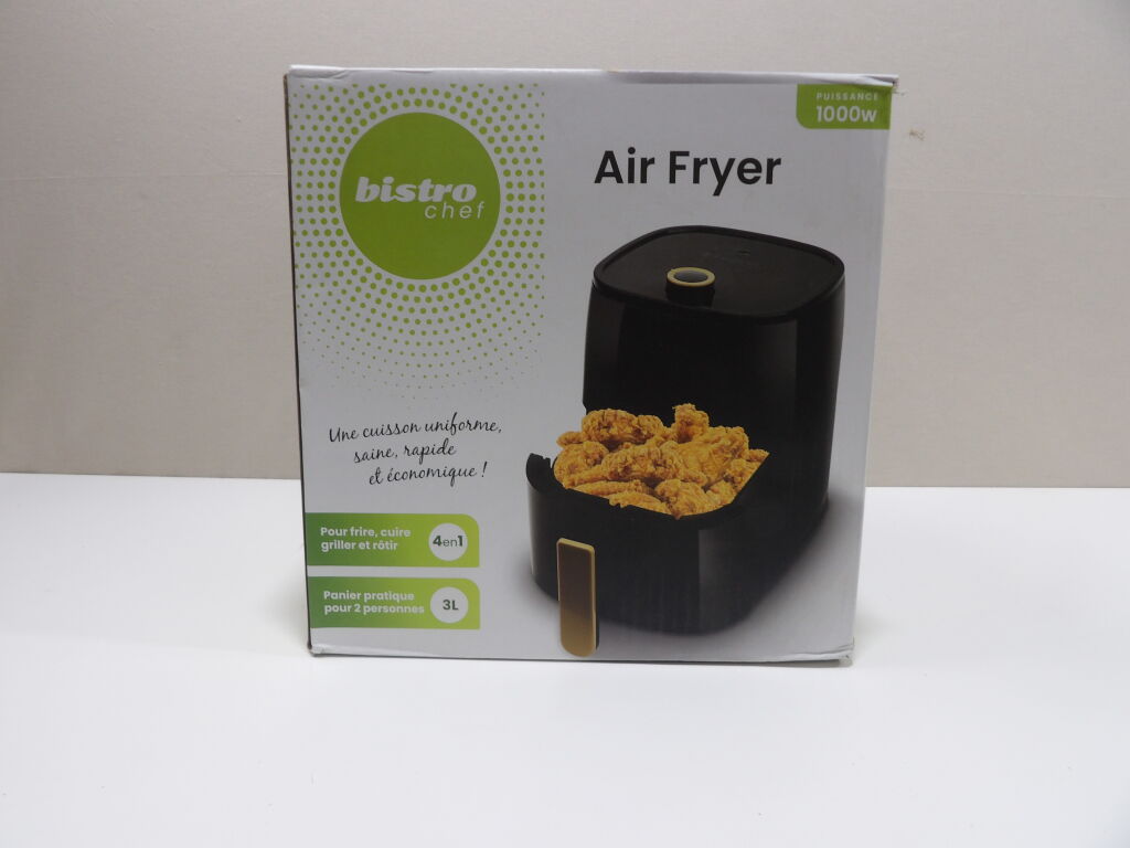 Lot de x2 Petits électroménagers : Airfryer BISTOCHEF (3L pour 2 personnes, on y inclut des papiers cuissons et Appareil a raclettes cube (4 personnes). (Semblent NEUFS ou peu utilisés boites descellées et abimées).