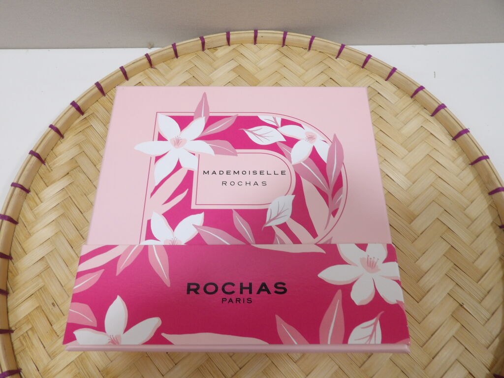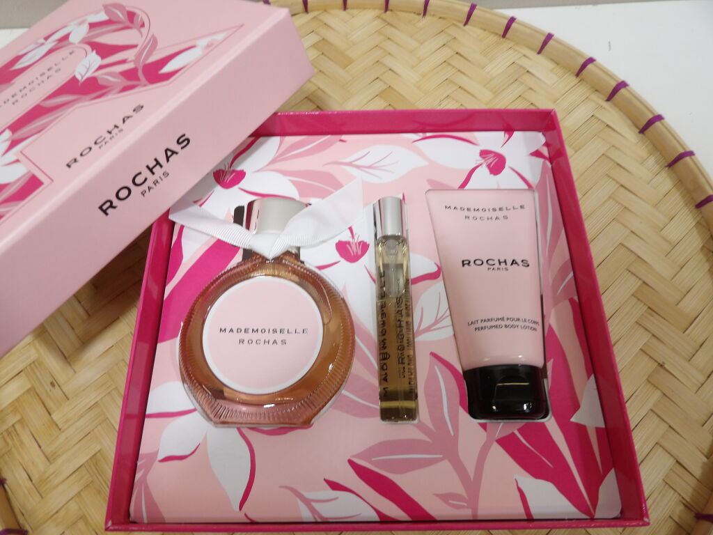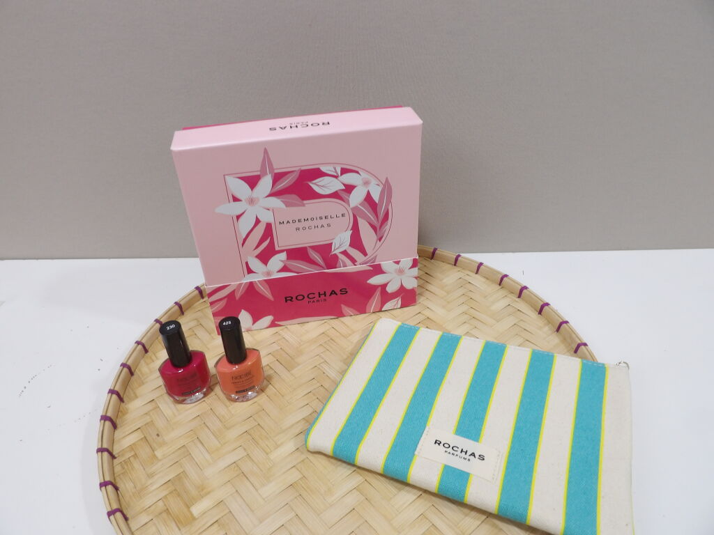 MADEMOISELLE ROCHAS - Coffret comprenant eau de parfum 50ml + vaporisateur de voyage 7.5ml + Lait parfumé pour le corps 50ml - On y joint une pochette Rochas ainsi que 2x vernis à ongles Nocibé
