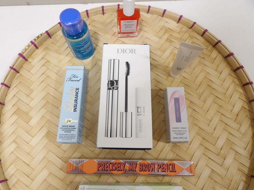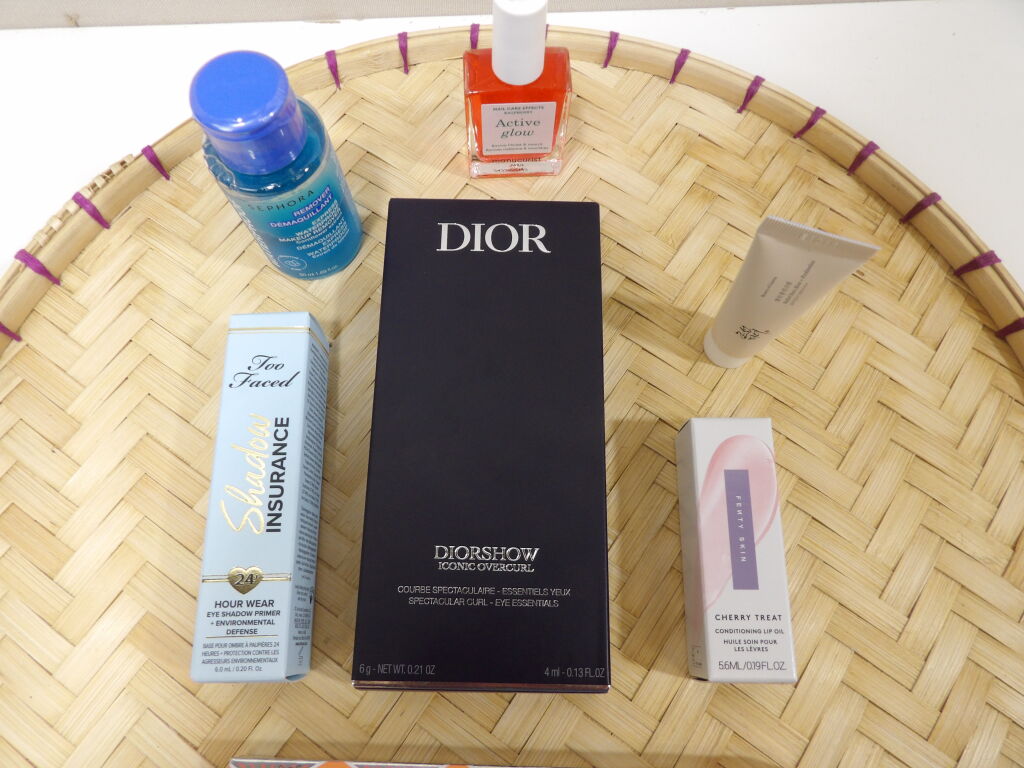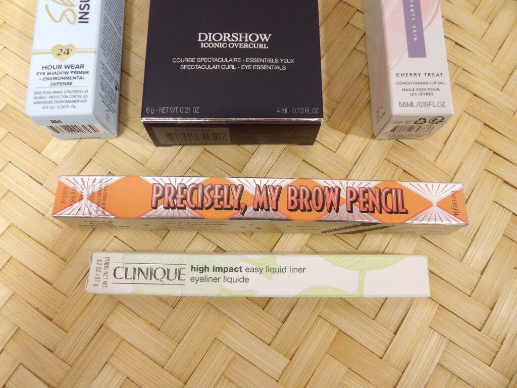 MAQUILLAGE - Lot de 5 articles NEUFS: - Mascara DIOR iconic overcurl noir - 4ml + Crayon sourcil BENEFITcoloris warm light brown 0.08gr + Eyeliner CLINIQUEnoir 6.7gr + Base pour ombre à paupières TOO FACED 6ml + Huile soin pour lèvres FENTY SKIN - On y joint 1 démaquillant et active glow Manucurist