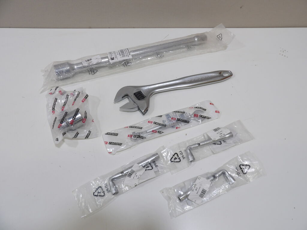 OUTILLAGE - FACOM - 1 Lot de 7 artricles divers de clés FACOM -1 Clé à molette réglable de 300mm de long , ouverture 41mm(Réf: 101.12) - 1 Clé de mixte de 13 (Réf:440.13) - 3 Clés en tube de 9 (Réf: 92A.9) - 1 Rallonge 3/4 de 400mm (Réf: K.215B) et 1 Douille hexagonale en 27 (Réf: S.27.H)