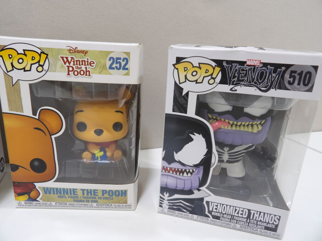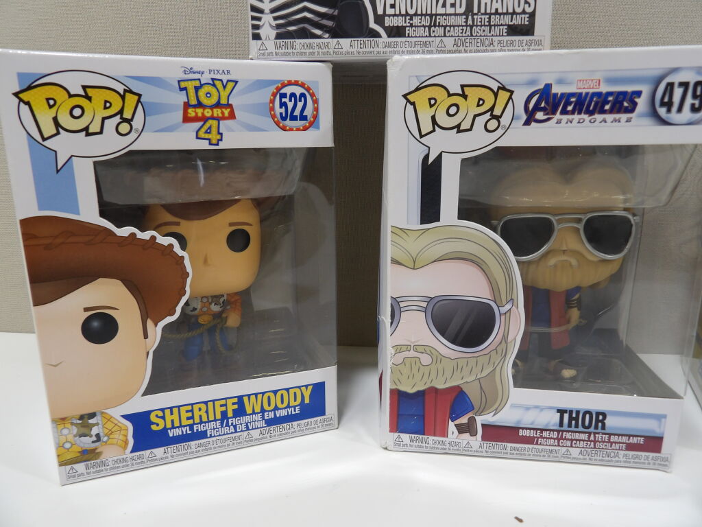 POP : Lot de x4 (certains emballages abimés) : Avengers THOR 479 + Vernomized Thanos 510 + Toy Story Sheriff Woody 522 + Winnie l'ourson 252.