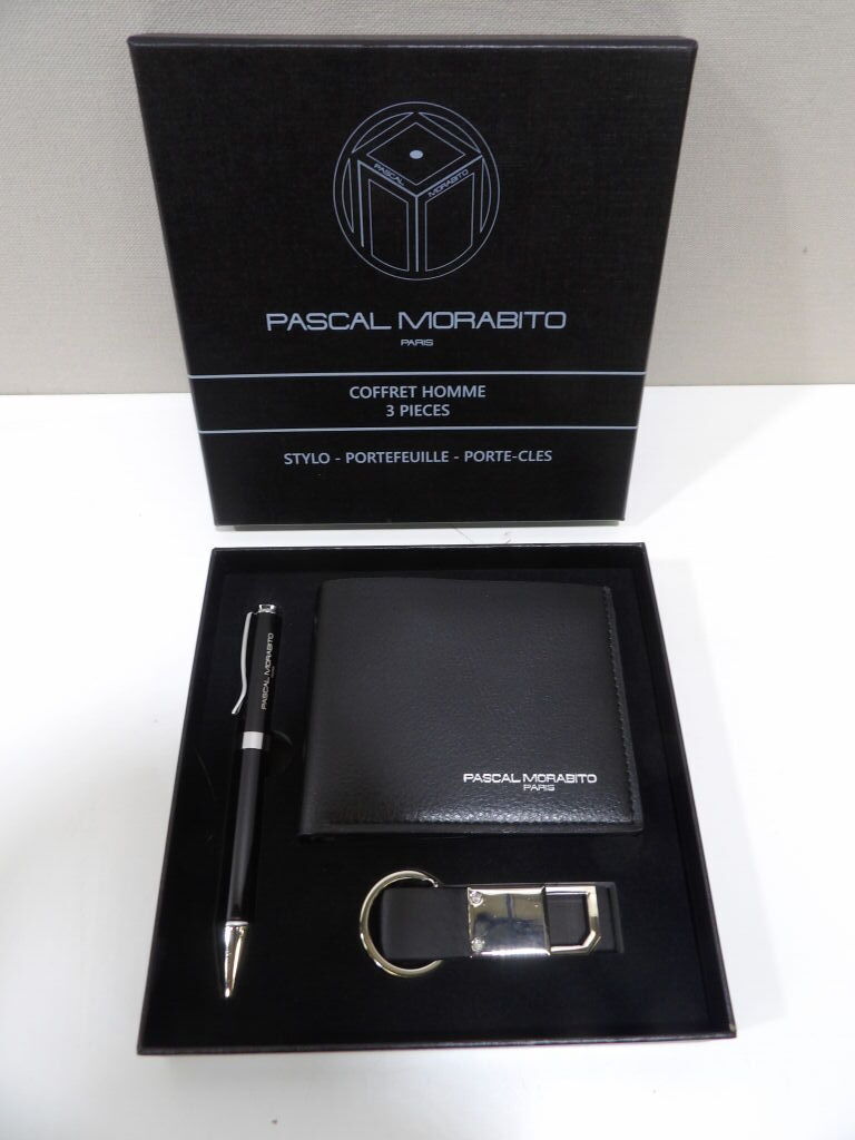 Pour Madame et Monsieur : lot de x3 accessoires NEUFS : LE TANNEUR Porte-chéquier et cartes (attention coup de cutter présent en bas du dos) 19x11CM et porte monnaie POLICE noir. On y inclut un coffre Homme 3 pièces - PASCAL MORABITO.