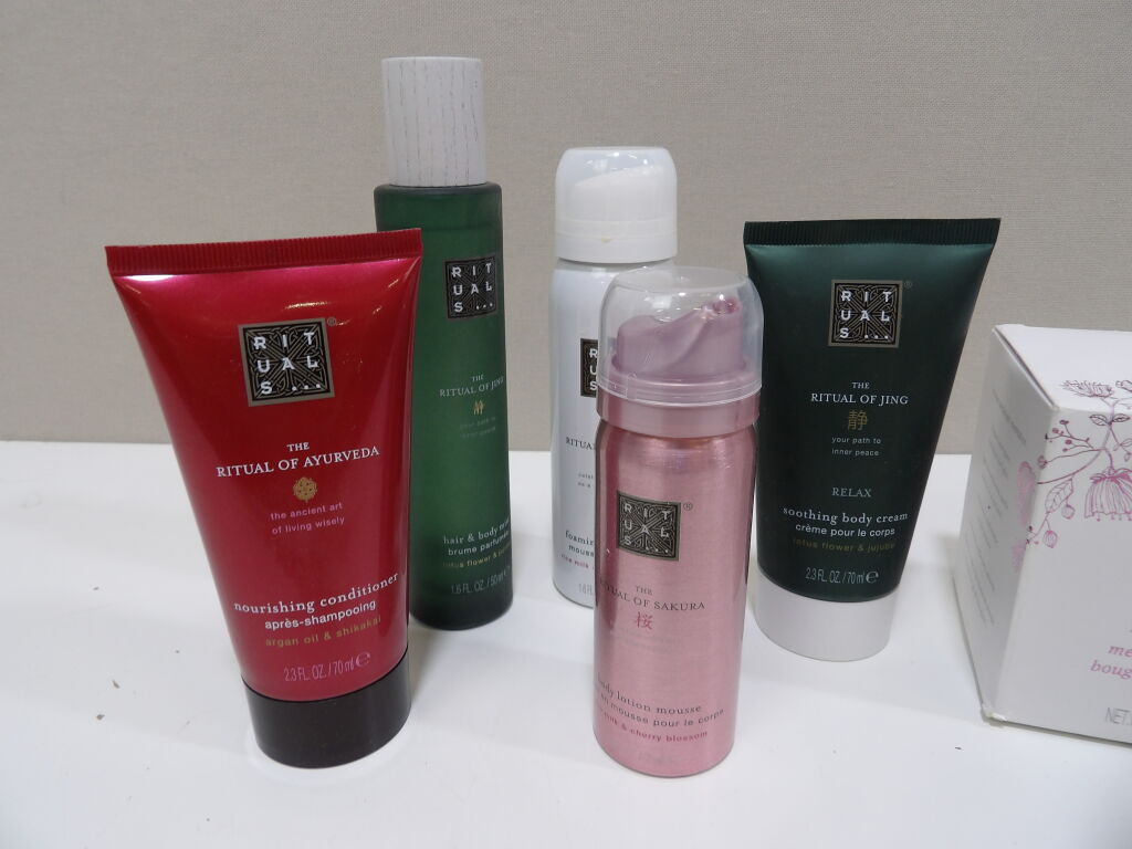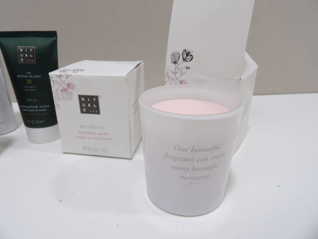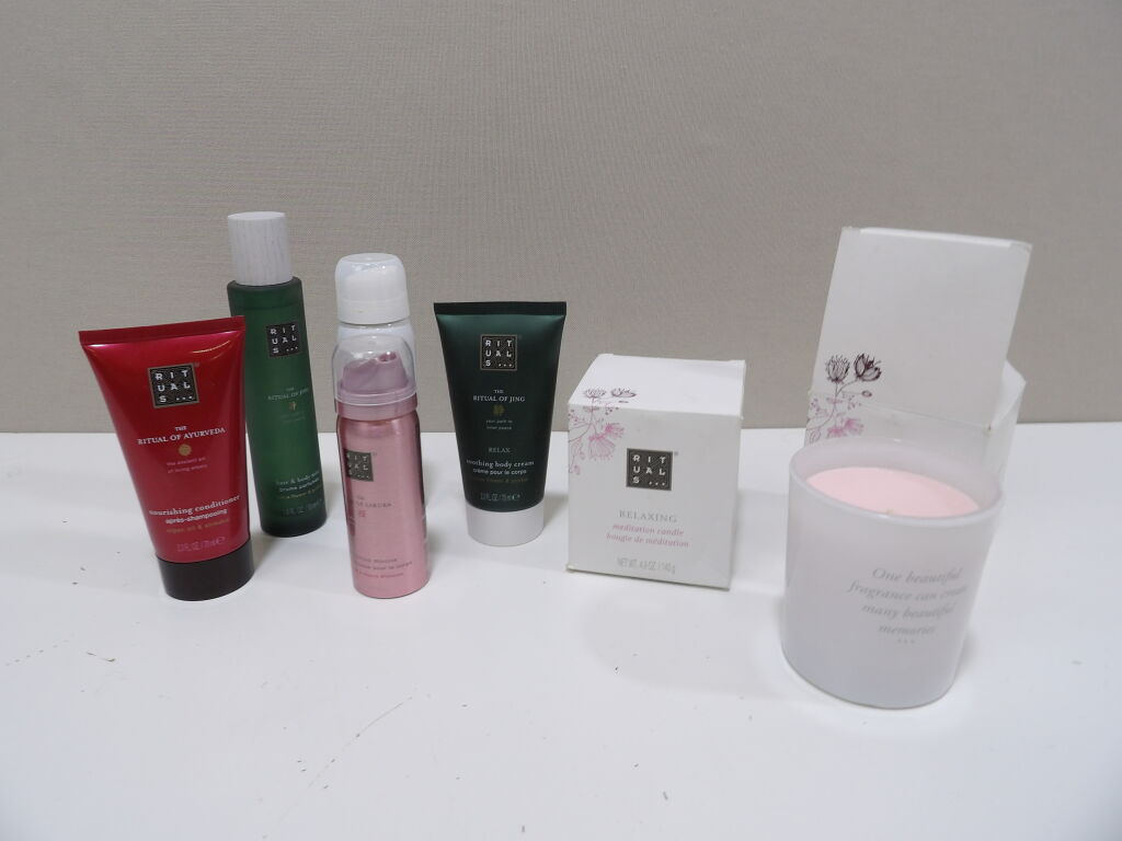 RITUALS : Lot de x2 bougies de méditation neuves (140g), on y inclut x5 soins descellés (neuf?occasion?) : après shampoing, brume parfumée, mousse de douche, crème pour le corps....