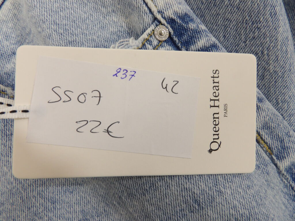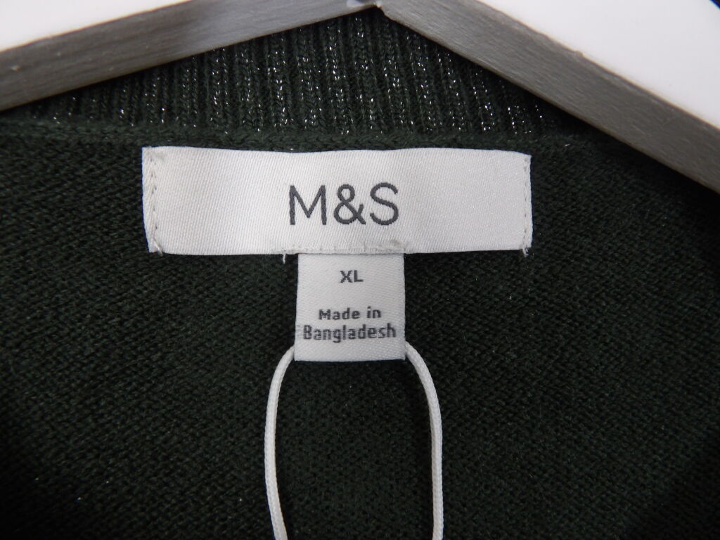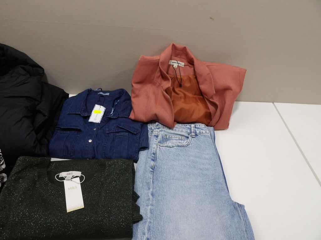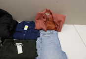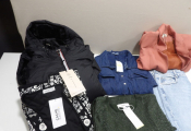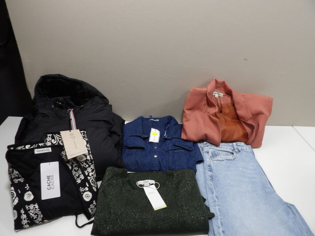 Vêtements FEMME : x6 articles en 42 / 44 / XL - NEUFS - : Pull vert brillant M&S, Gilet bohème Cache Cache, Jeans QUEEN HEARTS, Robe denim GERARD PASQUIER, Veste Blazer rose GRAIN DE MALICE, et Parka longue MELYA MELODY.