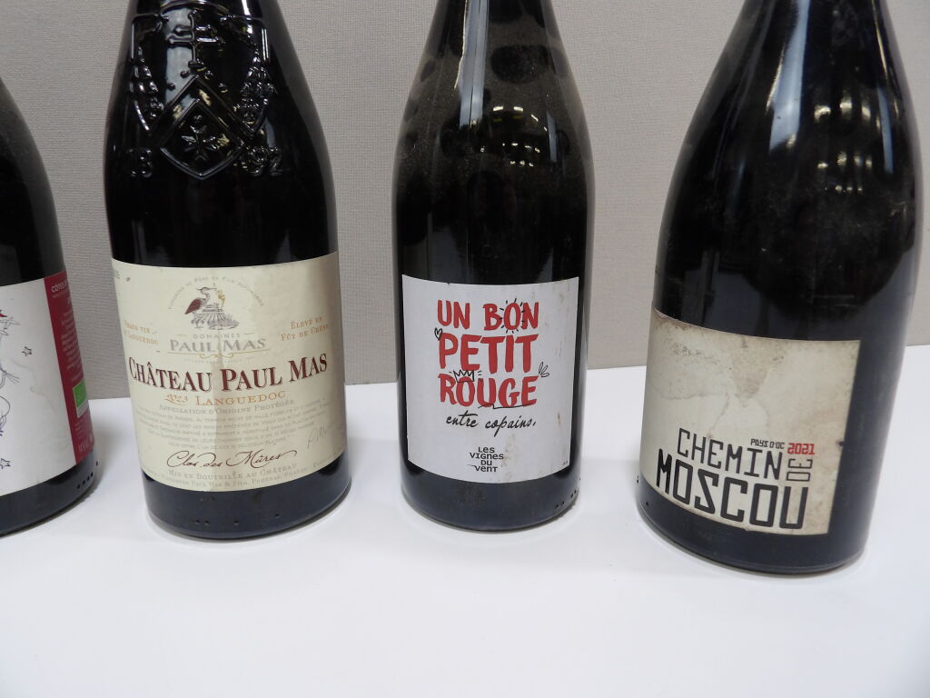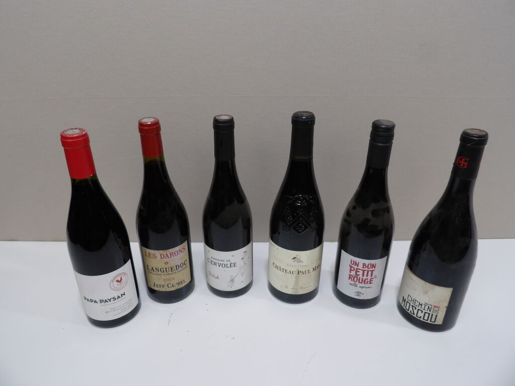 VINS ROUGE du Sud ensoleillé LANGUEDOC et PAYS d'OC x6 bouteilles : x1 Chateau Paul Mas Languedoc 2023, x1 Un bon petit rouge entre copains Les vignes du vent 2023, x1 Chemin de Moscou 2021, x1 Domaine de L'Envolée prélude 2023, x1 Les DARONS Languedoc 2023, et x1 MANZOTTE Papa Paysan 2021.
