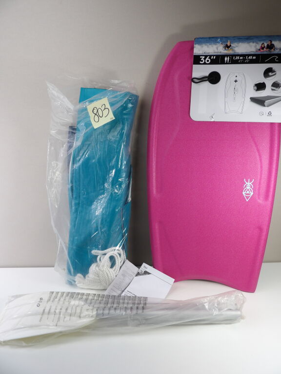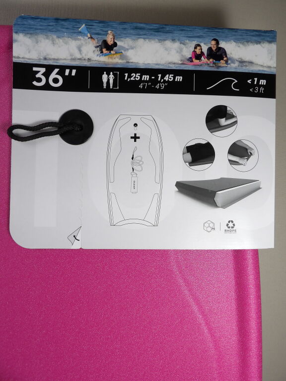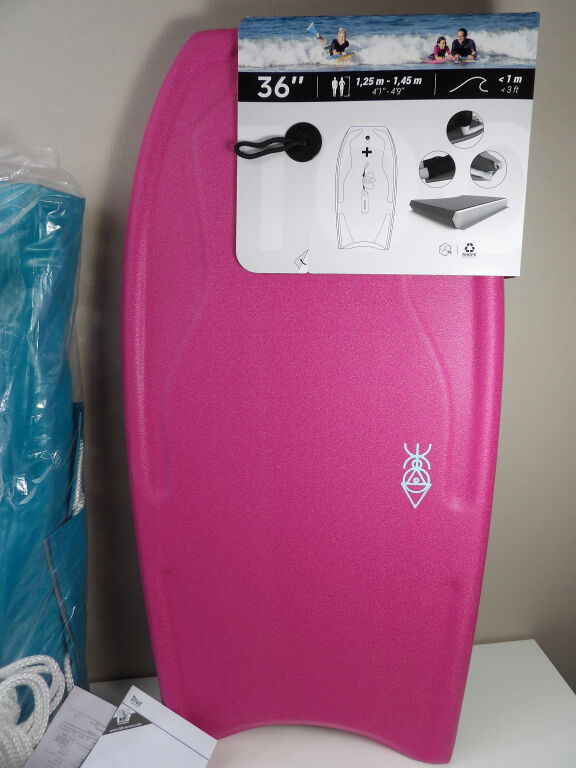 Référence IAN 86426. On y inclut un bodyboard NEUF de la marque Decathlon, référence OLAIAN 100 BODYBOARD 36", avec son leash poignet.