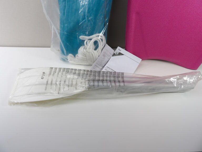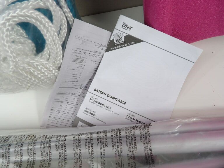 Bateau gonflable d'occasion LIDL, semble état correct, avec une palme.