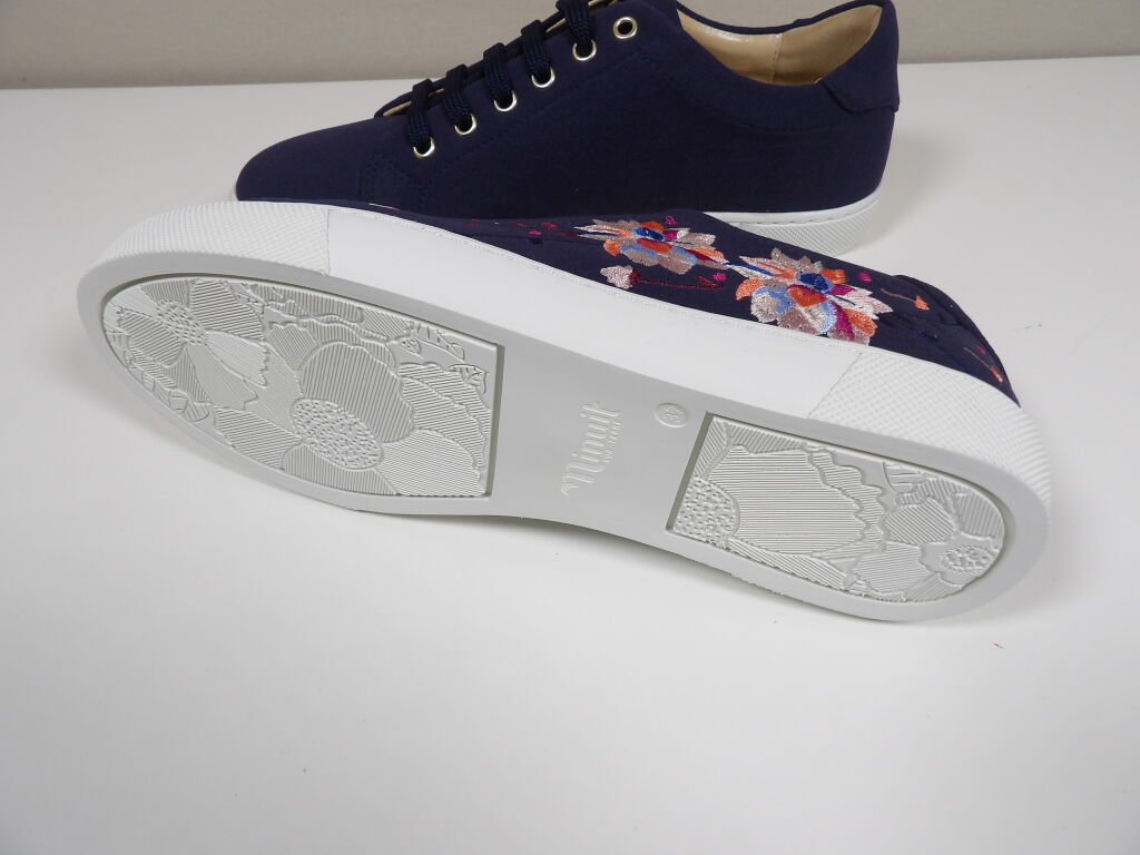 - Sneakers basses en toile et cuir bleu marine et broderie florale