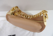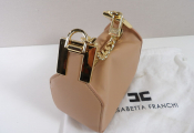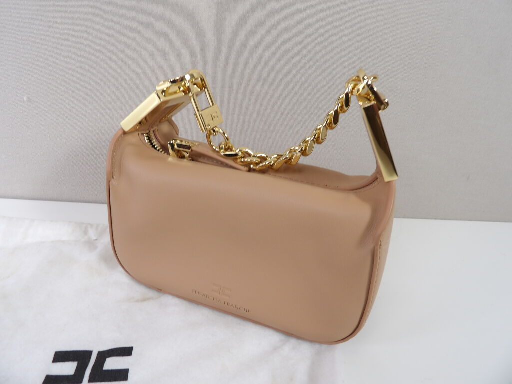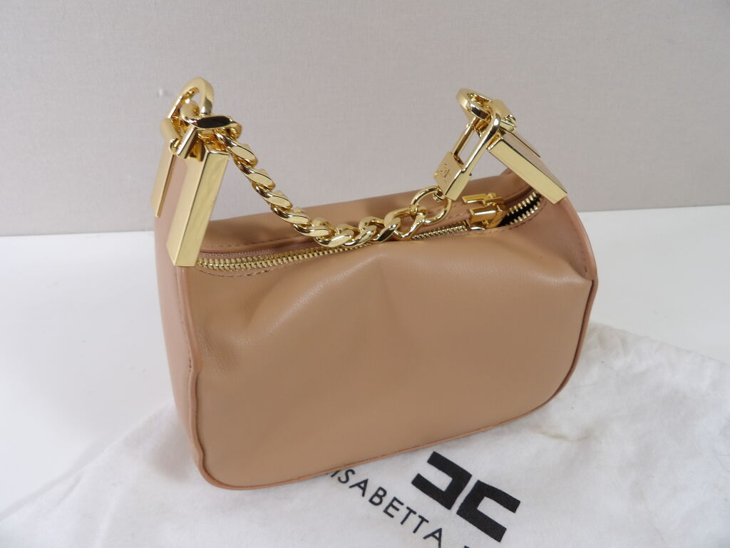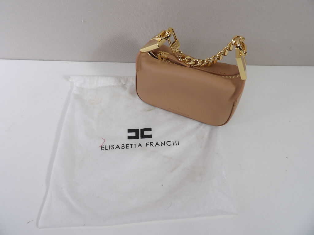 ELISABETTA FRANCHI - Petit sac à main en faux cuir camel rose, avec chaine dorée. (sans bandoulière), avec son dustbag. Fermeture zippée et petite poche intérieure zippée. Dimensions environ 18x12CM. Très bon état.