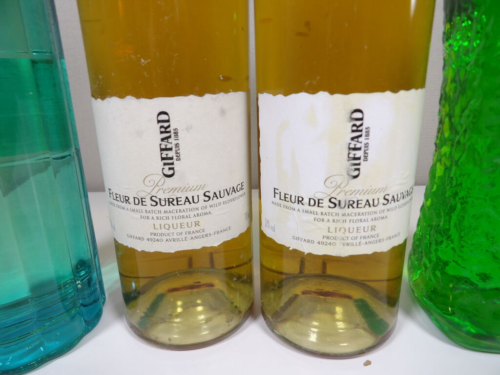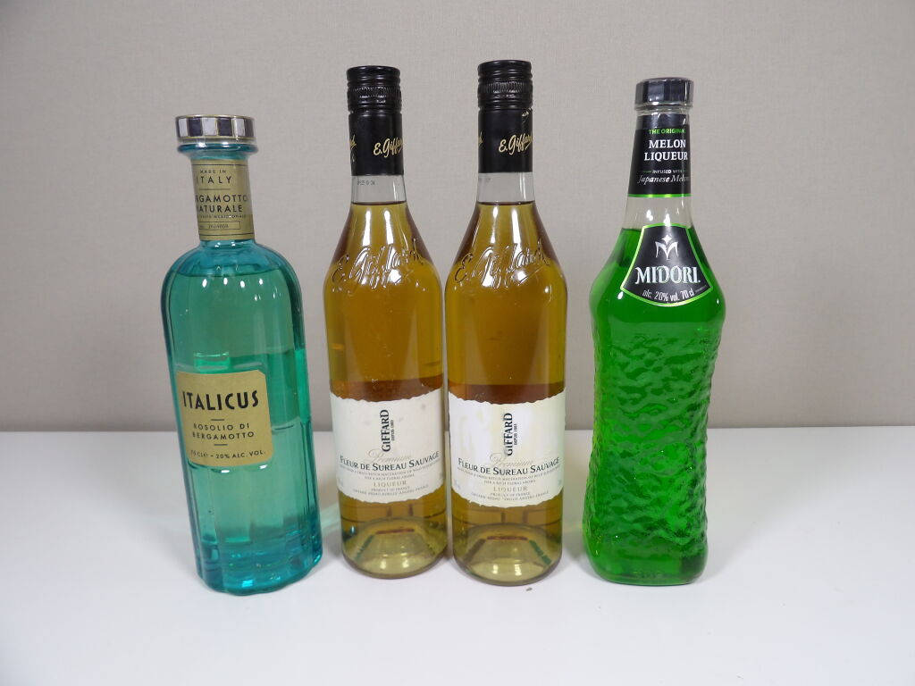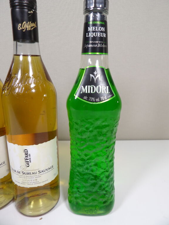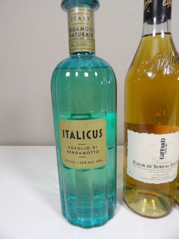 Liqueurs 4 bouteilles (70 cl) : 2x fleur de sureau sauvage maison Giffard, Liqueur de melon Midori et liqueur à la bergamotte Italicus.
