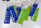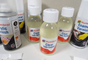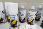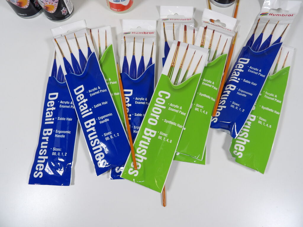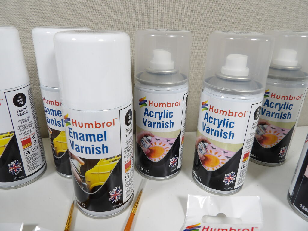 LOISIRS CREATIFS : Lot HUMBROL et autres : comprenant pinceaux, Bombes d'Acrylic varnish en spray, Vernis transparent satiné, et autres produits.