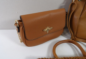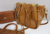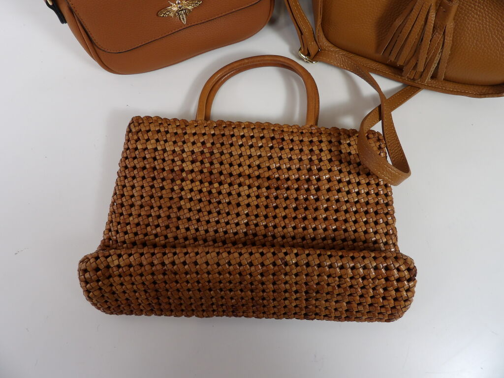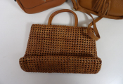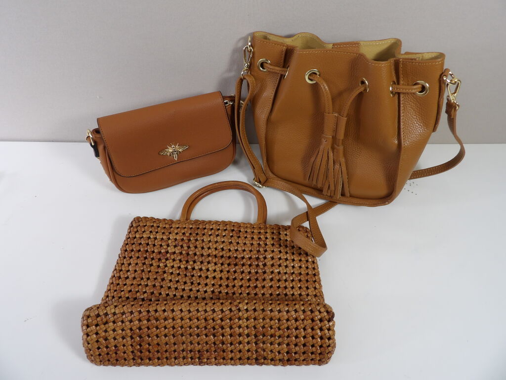Lot de x3 sacs à main de coloris CAMEL - sans marques, en cuir et simili - états neufs : Sac seau env. 28x23CM, Sac à main avec fermeture abeille env. 21x13cm et sac tressé env. 28x20CM.