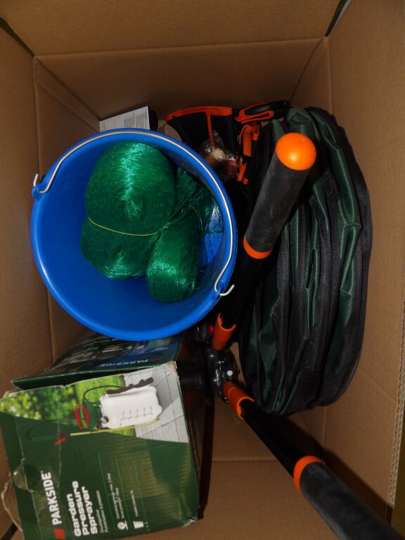 LOT ENTRETIEN EXTERIEUR NEUF + 25 pieces : Bac de dechet - Coupe branche - Secateur - Pulverisateur - Seau - GARDENIA etc...