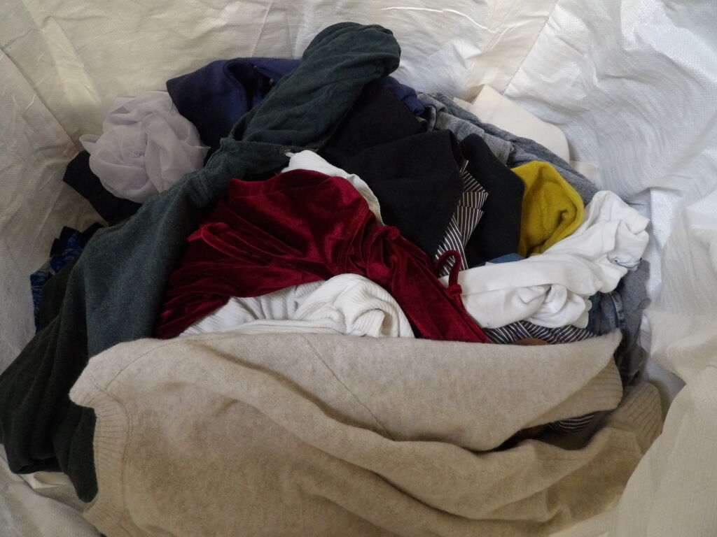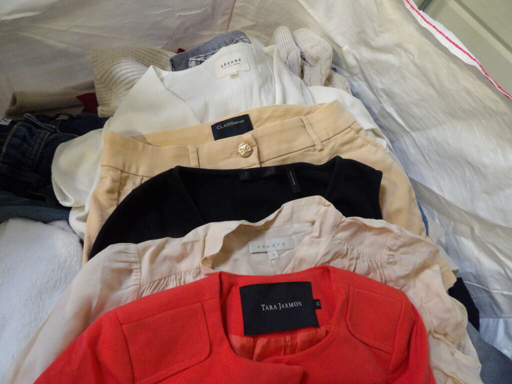 Palette de 200 pièces de vêtements d'occasion et certains neufs : Femme, Enfant, Homme ( divers gammes et marques dont Sandro, Tara Jarmon, Sezane...) - ATTENTION ce lot est d'occasion tous états et contient divers gammes donc de l'entrée type KIABI aussi. il n'est pas composé uniquement des marques citées.