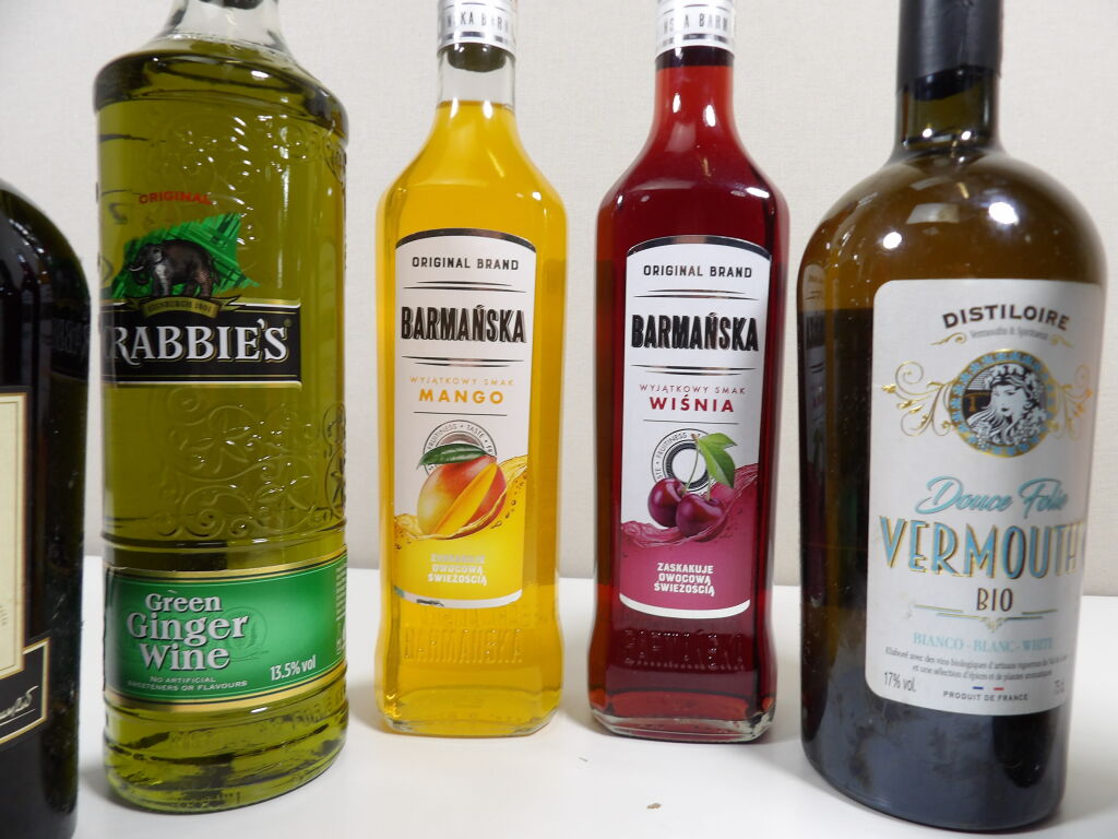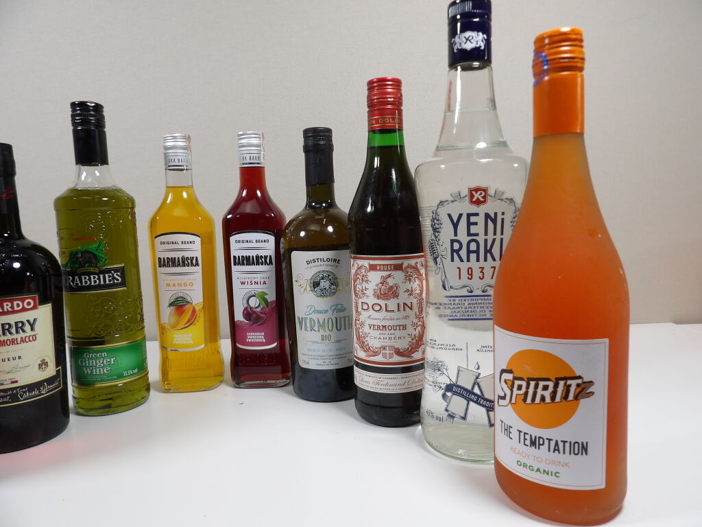 Spiritueux, pour vos cocktails : 9 bouteilles dont 2 de vermouth (1 rouge Dolin 75 cl et 1 blanc Distiloire Douce folie bio 75 cl), liqueurs Barmanska 2 bouteilles de 50 cl (mangue et cerise) liqueur Luxardo Cherry Sangue Morlacco (70 cl) Crabbie's green ginger wine (70 cl), spritz The Temptation prêt à boire (75 cl), Apertonik (préparation pour Spritz) 1L. et une bouteille de raki