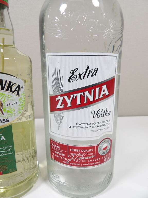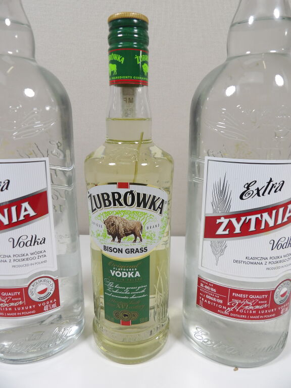 Spriritueux : Vodka 3 bouteilles 2 x Extra Zynta 1 L. (vodka polonaise dont une bouteille bouchon abîmé) et Zubrowka 0,5 L.