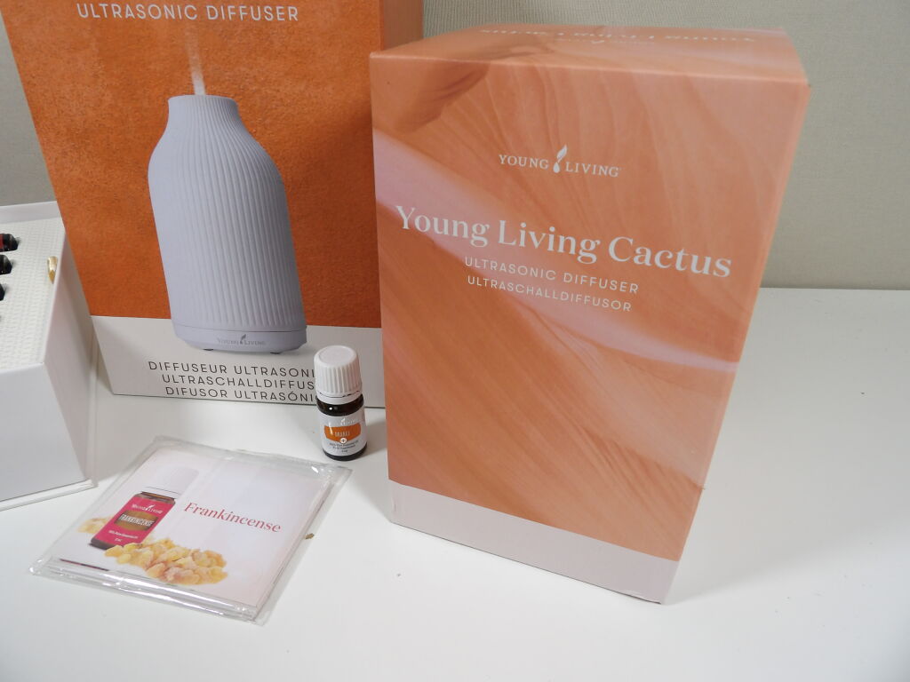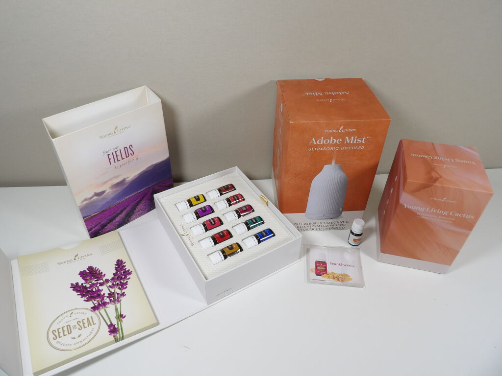 YOUNG LIVING - Diffuseur ultrasonique Adobe Mist NEUF (boite descellée), avec petit diffuseur ultrasonique Cactus (en beige) neuf aussi (boite descellée) et on y inclut un coffret d'huiles essentielles - from our FIELDS to your family.
