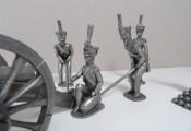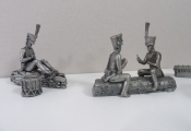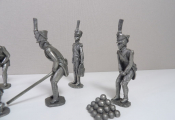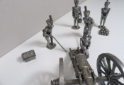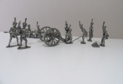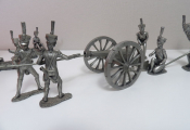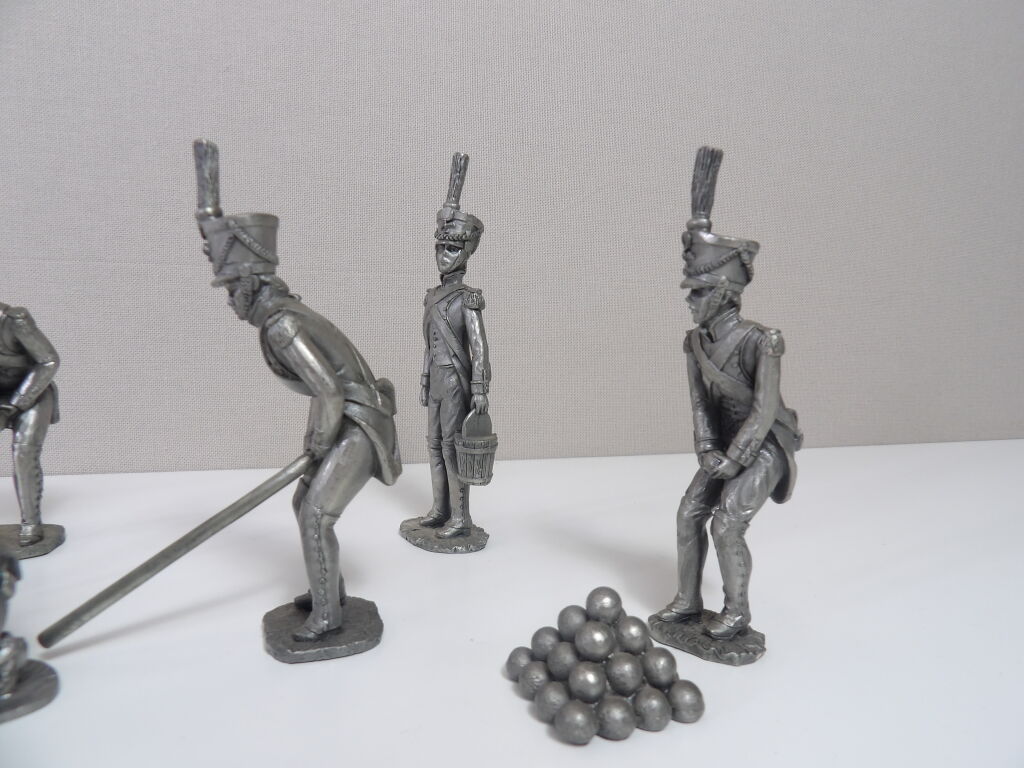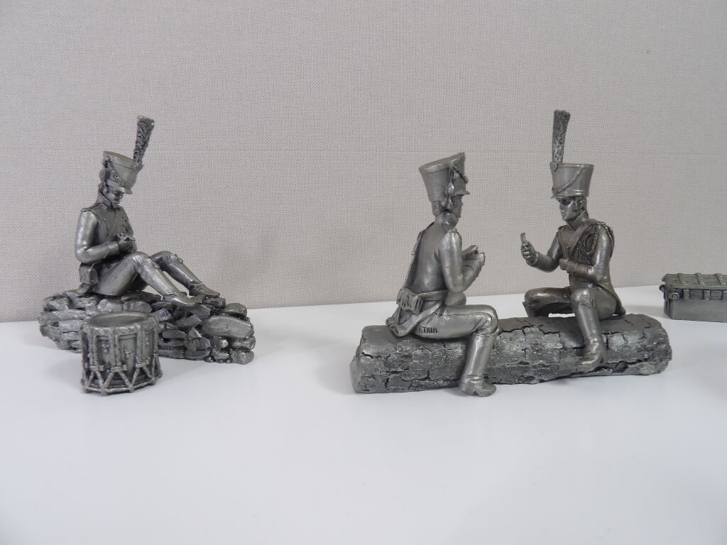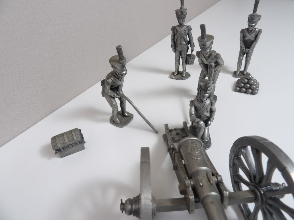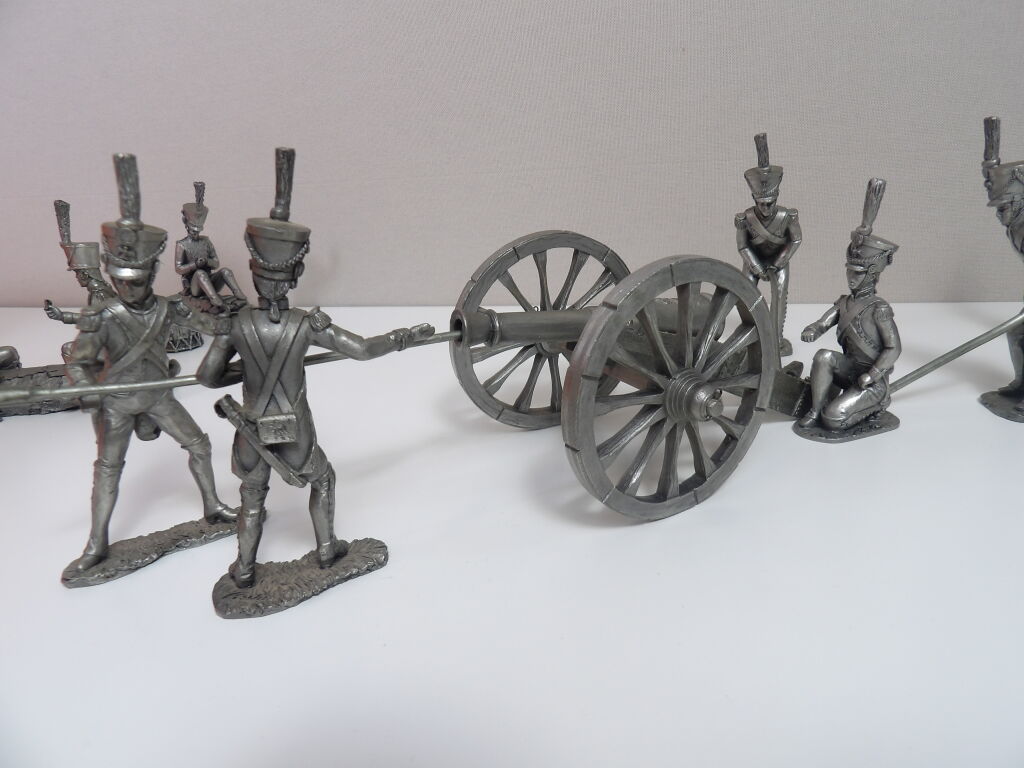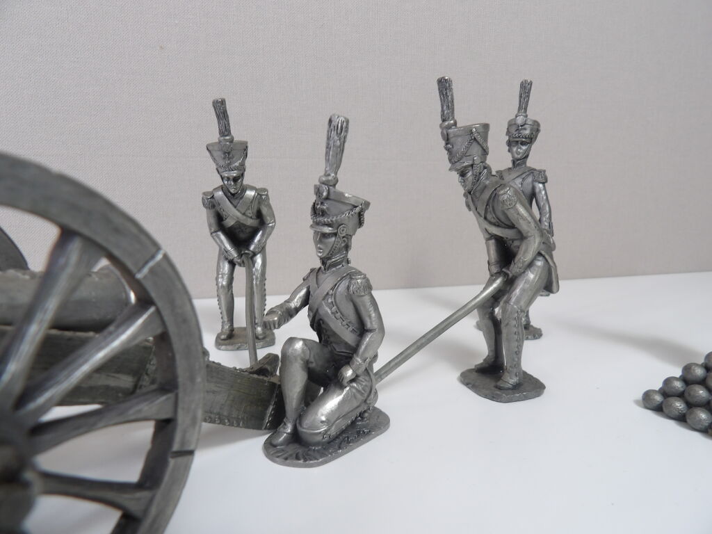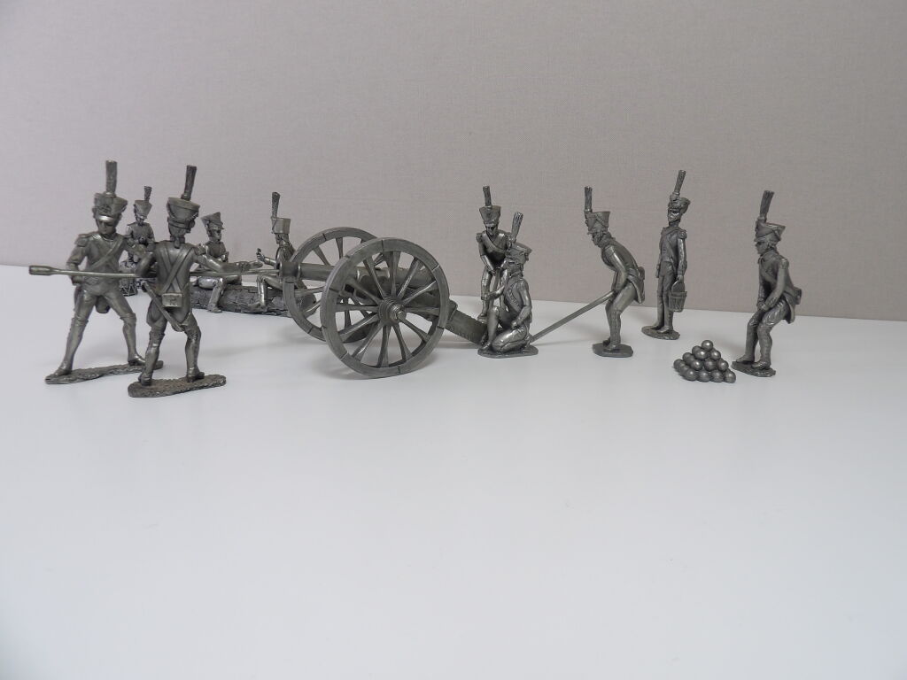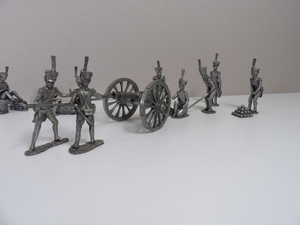 10 Soldats napoléoniens en étain avec un canon signé Bachet , éléments de décor (tronc, muret de pierres, tambour, coffre), 2 artilleurs tiges abîmées