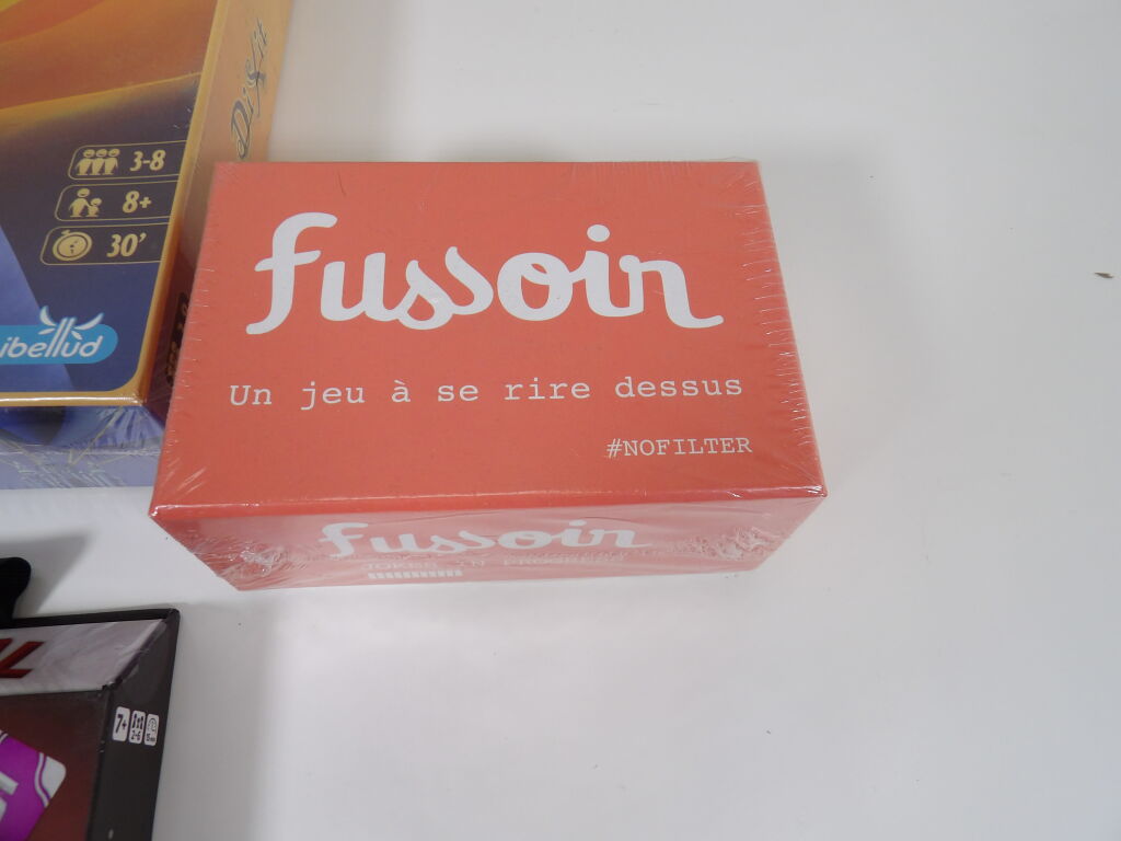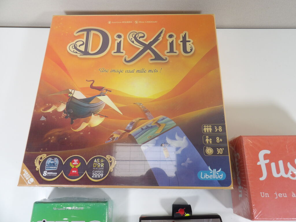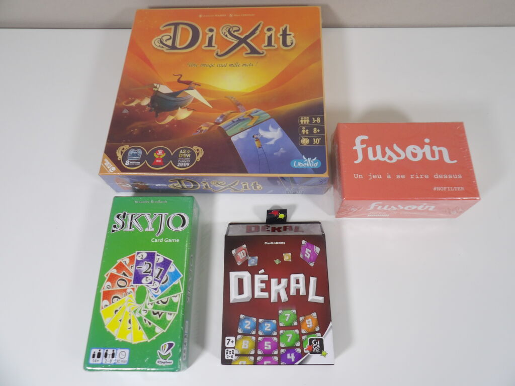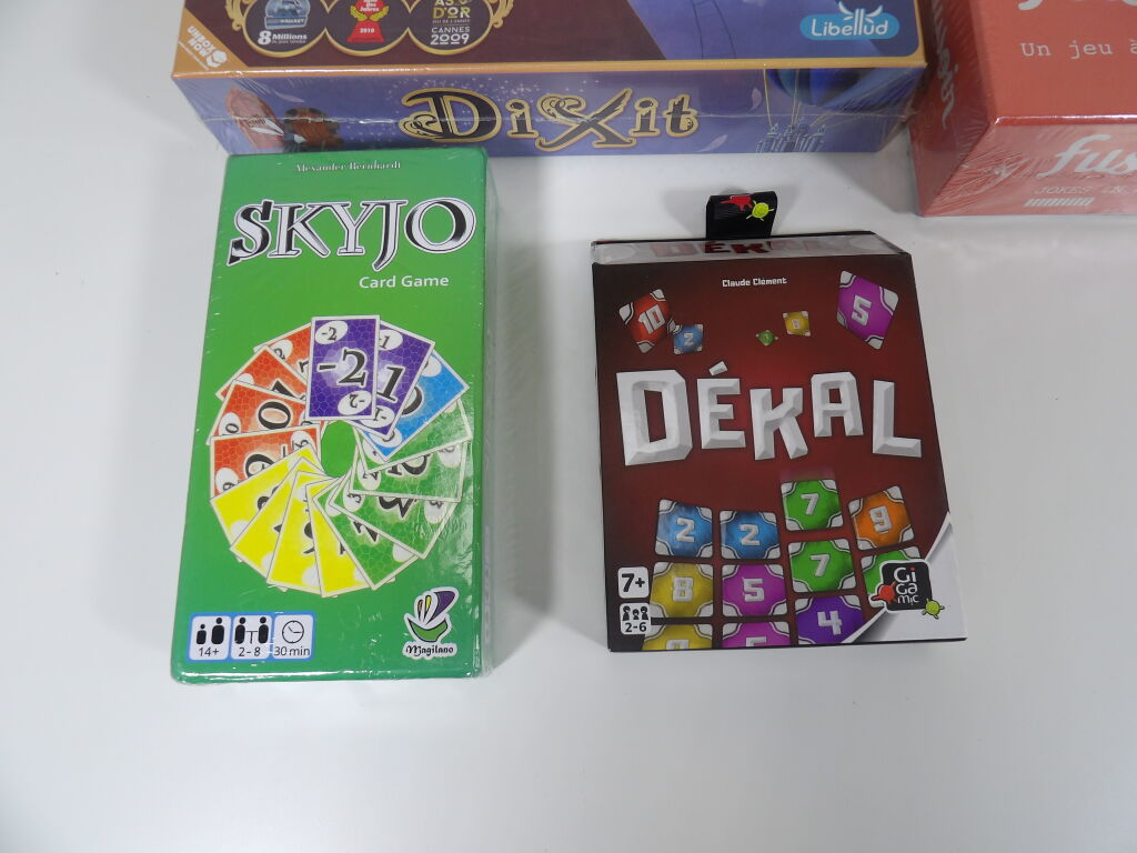 4 jeux de société neufs dont Dixit, Skyjo, Dékal et Fussoir.