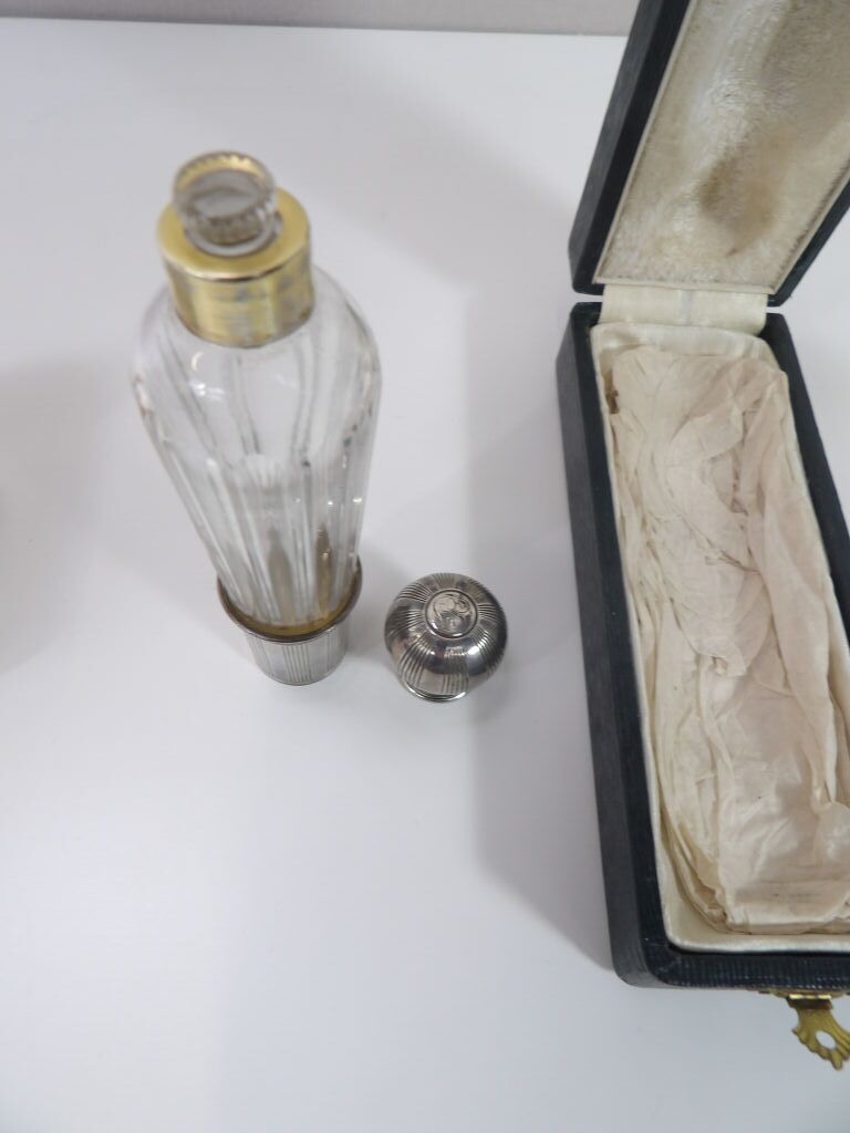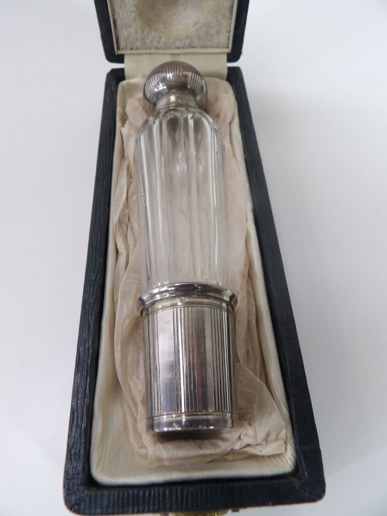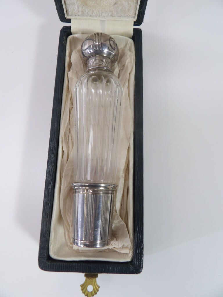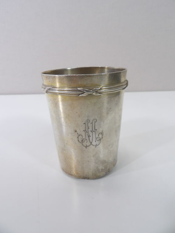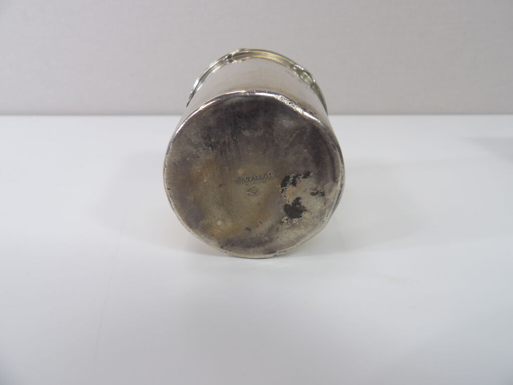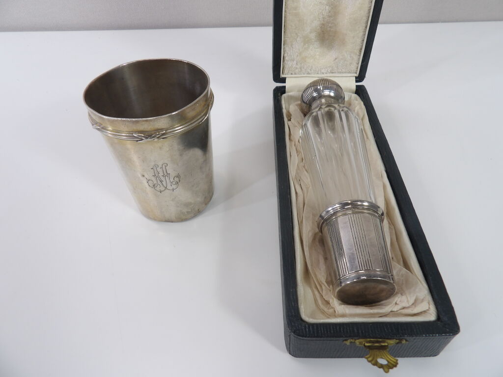 Argenterie : une timbale en argent poinçon minerve, par AM TALLOIS (orfèvre parisien), monogramée, choc (102,70 g.) on y joint un flacon de parfum en verre monture et bouchon en argent (poinçon Minerve)