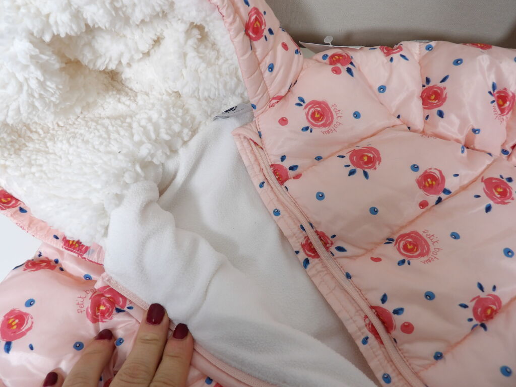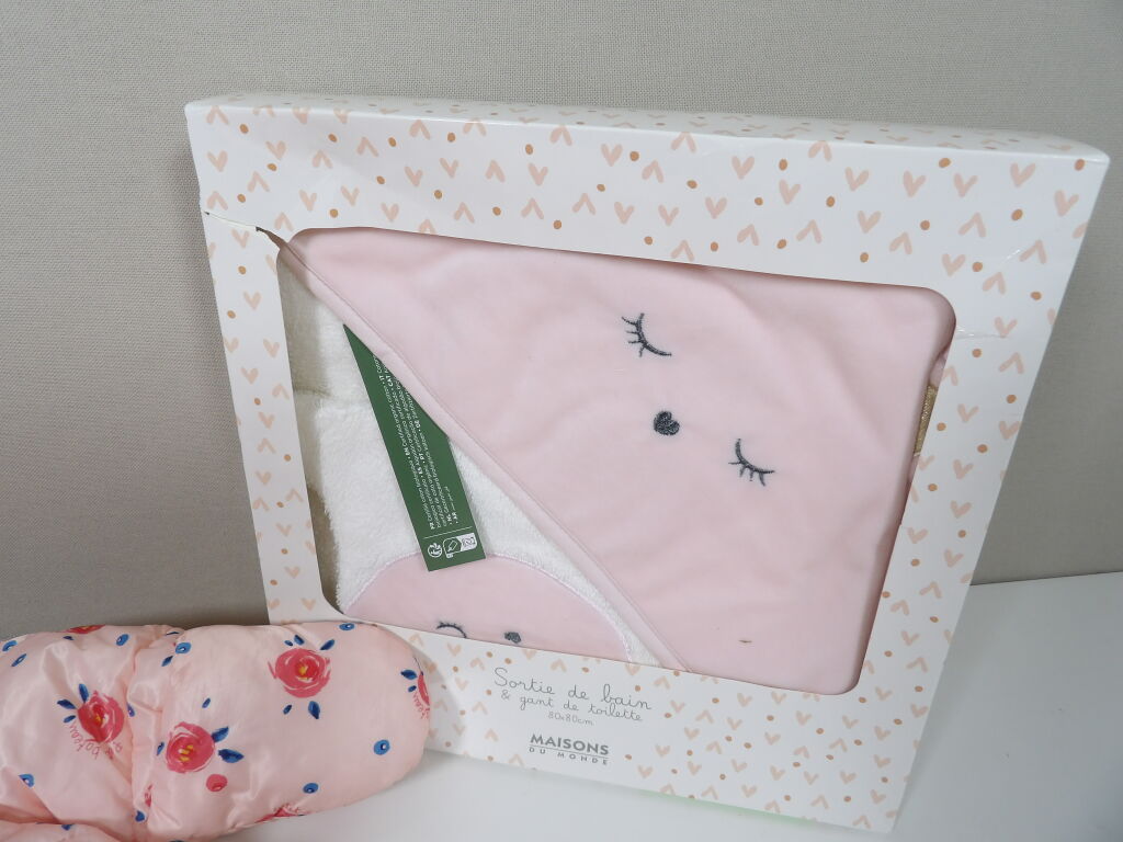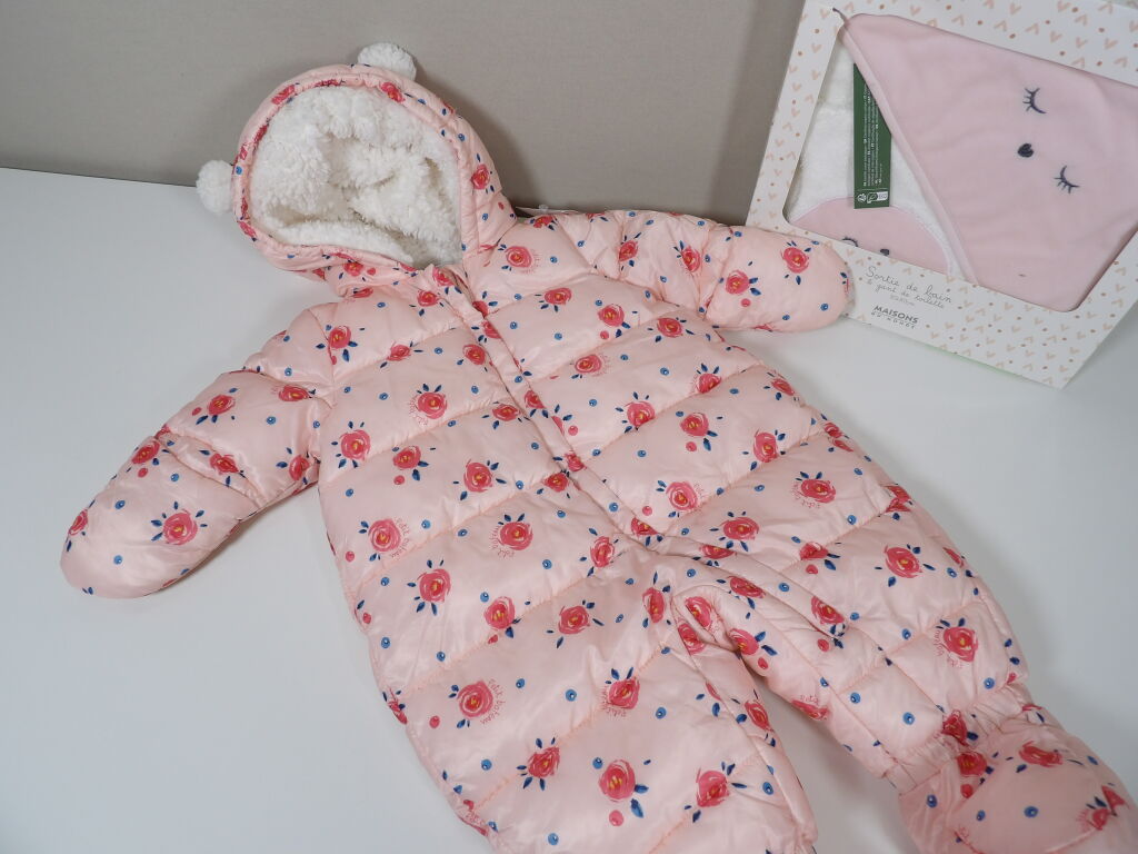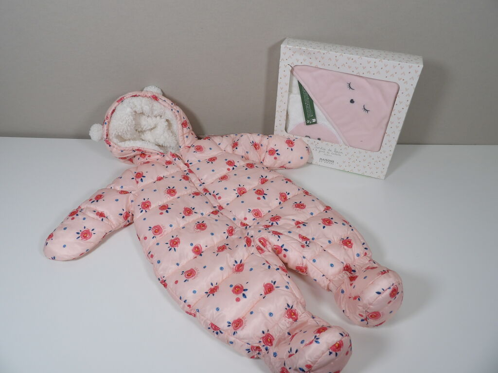 Combipilote hiver fille PETIT BATEAU 6M (67CM), et sortie de bain 80x80 CM / gant de toilette MAISONS DU MONDE. NEUFS avec étiquettes.