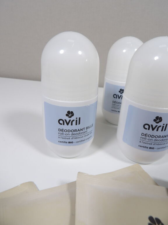 Cosmétiques Avril : 6 déodorants (50 ml) et 11 sachets recharge shampoing sec (30 g.)