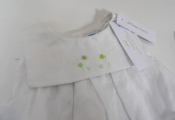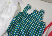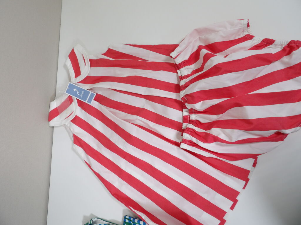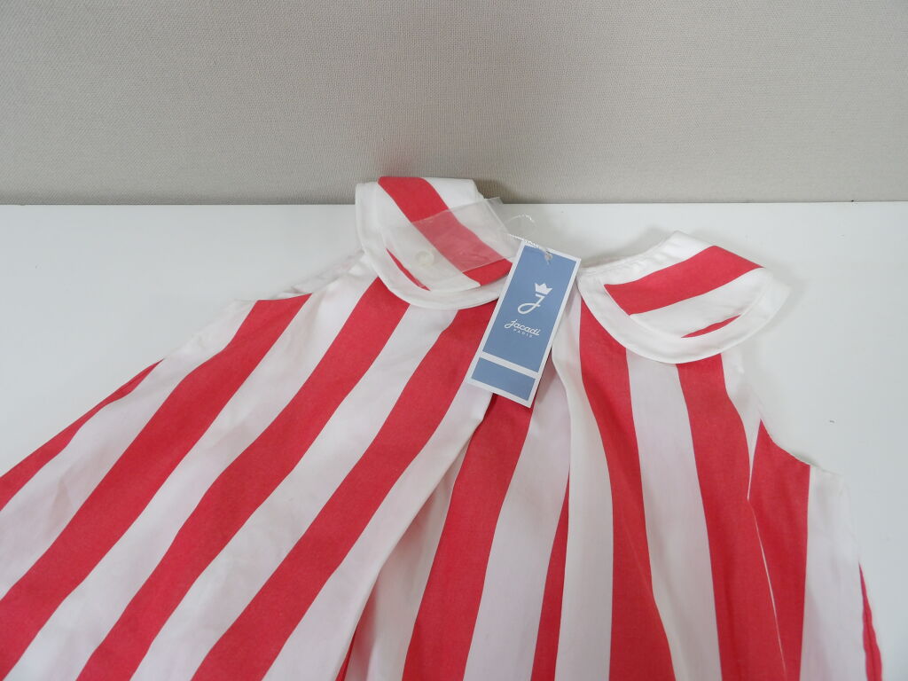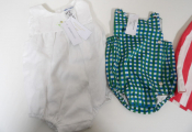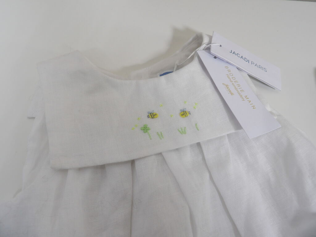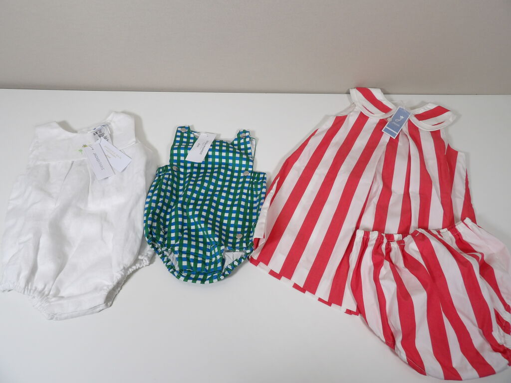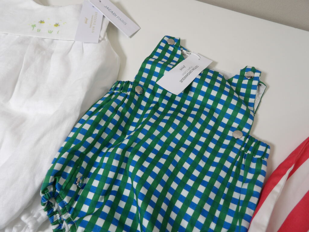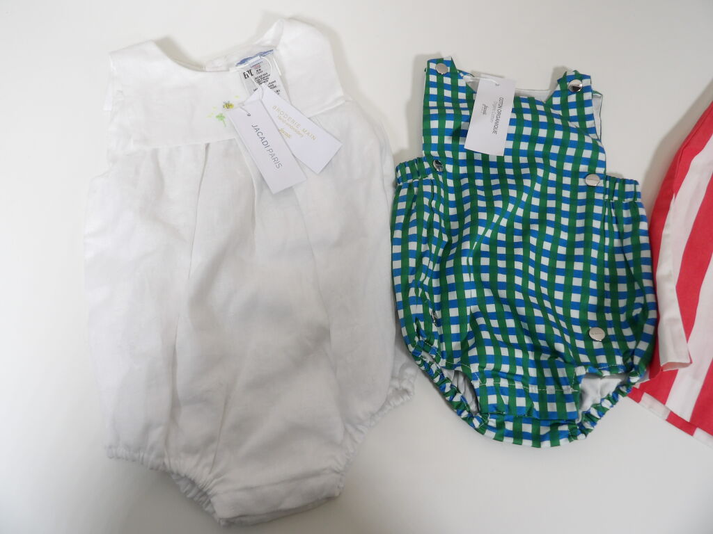 JACADI Lot de x3 articles NEUFS avec étiquettes: Combinaison vichy bleu et vert en 1M, Barboteuse en lin blanc avec broderies 12M, et Robe chasuble avec culotte rayée rose rouge / blanc en 24M. Pensez aux achats de noël pour votre entourage !