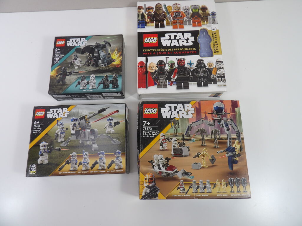 Légo Star Wars : 3 ensembles n° 75372, 75412 et 75345 neufs scellés, on y joint un livre d'occasion (sans la figurine) sur les personnages.