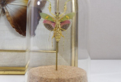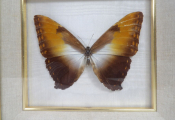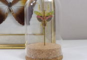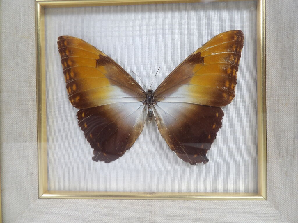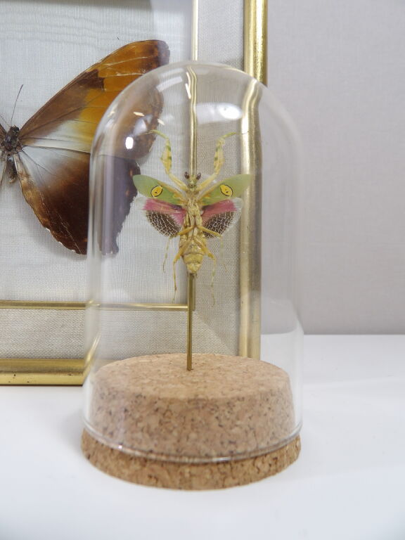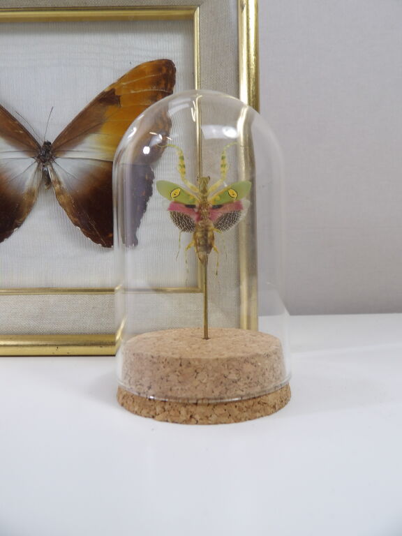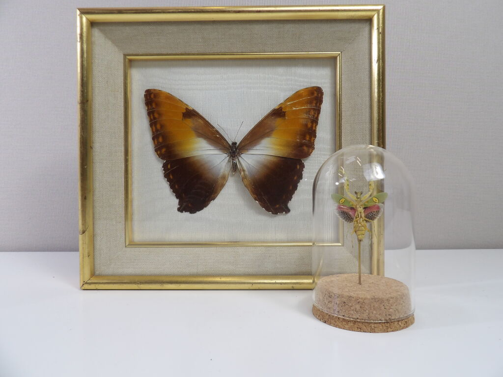 Lépidoptérophilie : un papillon naturalisé encadré sous verre, ainsi qu'une mante creobroter gemmatus (femelle) d'Indonésie sous cloche en verre, idéal cabinet de curiosité.