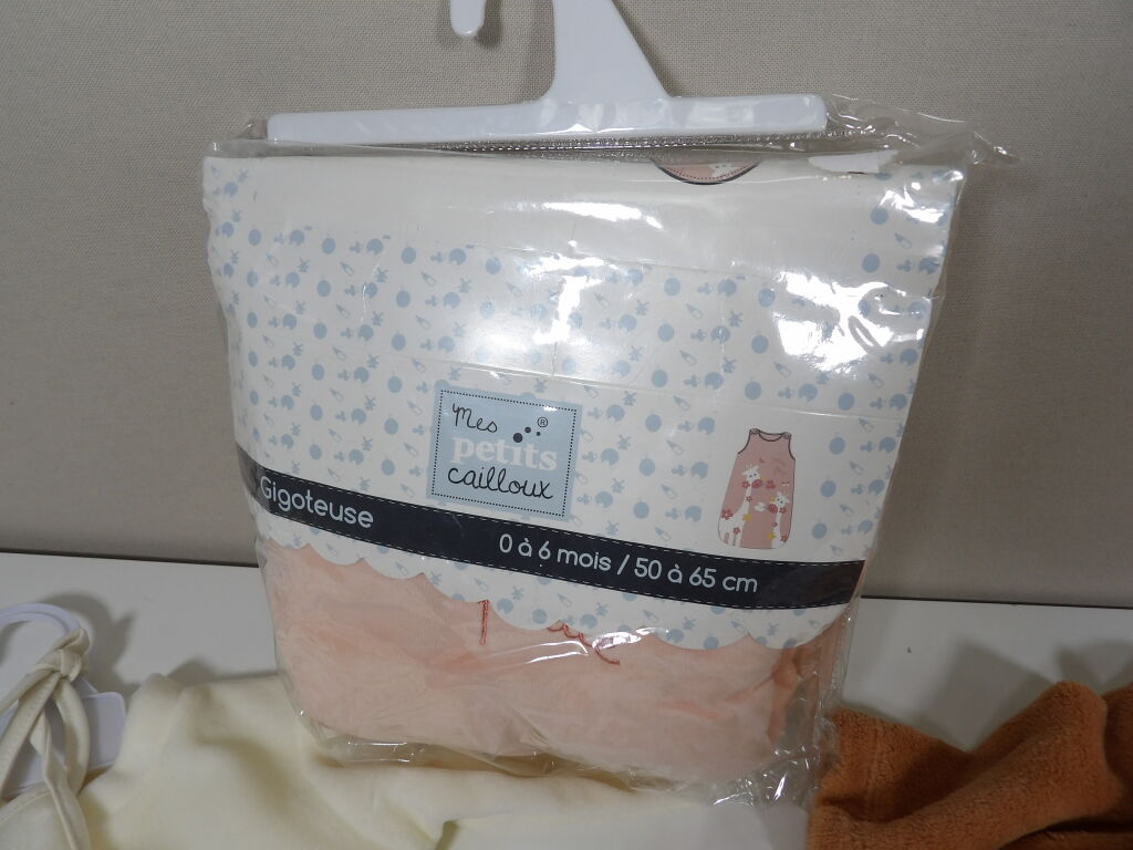 Lot BÉBÉ pour le dodo : Gigoteuse 0 à 6M (Mes petits cailloux), et 2 pyjamas 3/6M, ainsi qu'un pack de 7 bodies primark en 0-1M.
