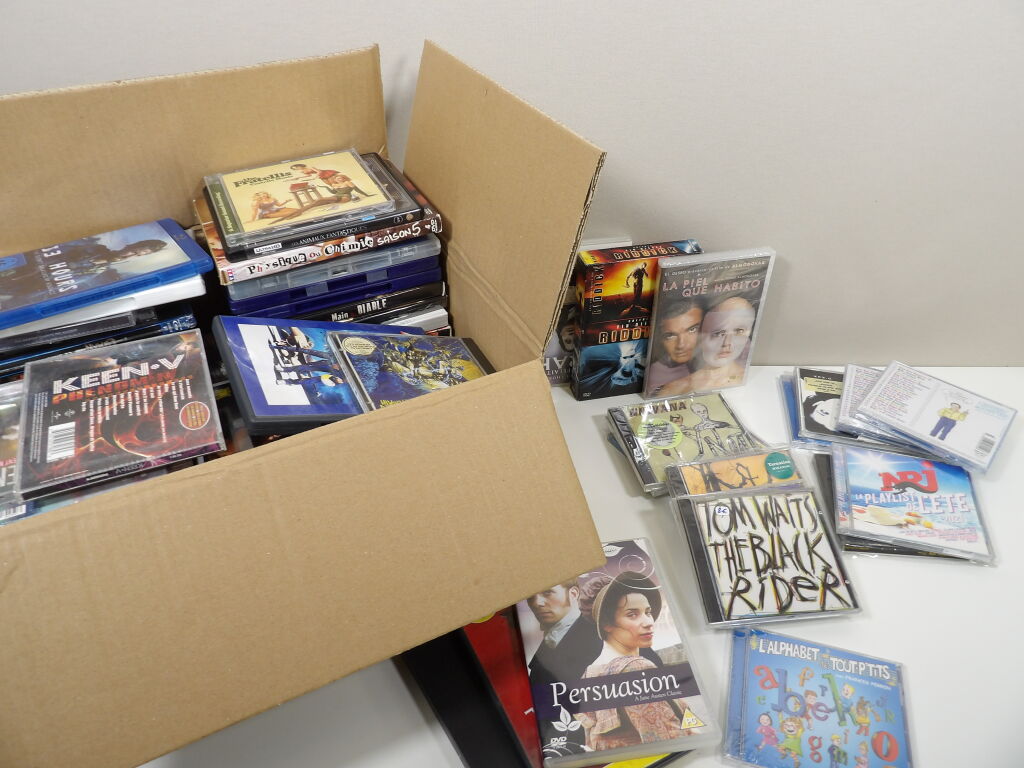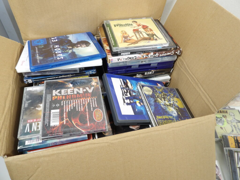 Lot de +80 divers CD-ROM, DVD, CASSETTES, jeux de PC et autres, d'occasion et certains neufs. Vendus en l'état, non testés, nous ne garantissons pas la complétude.