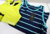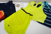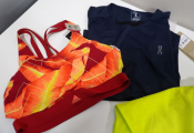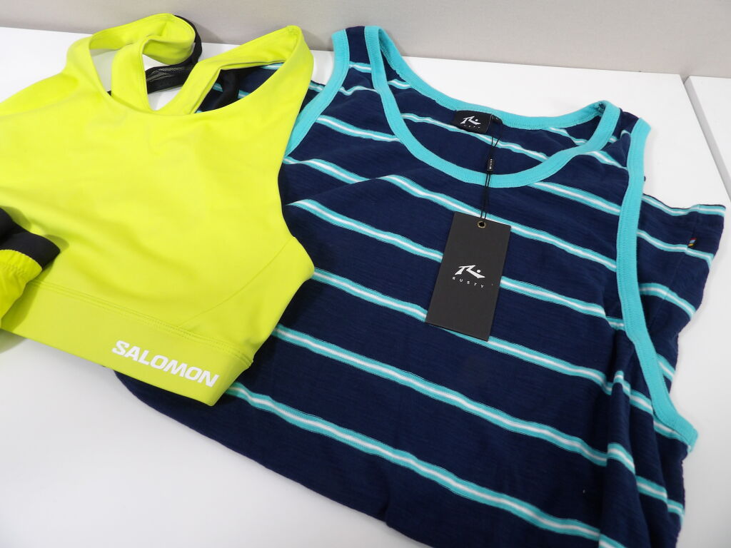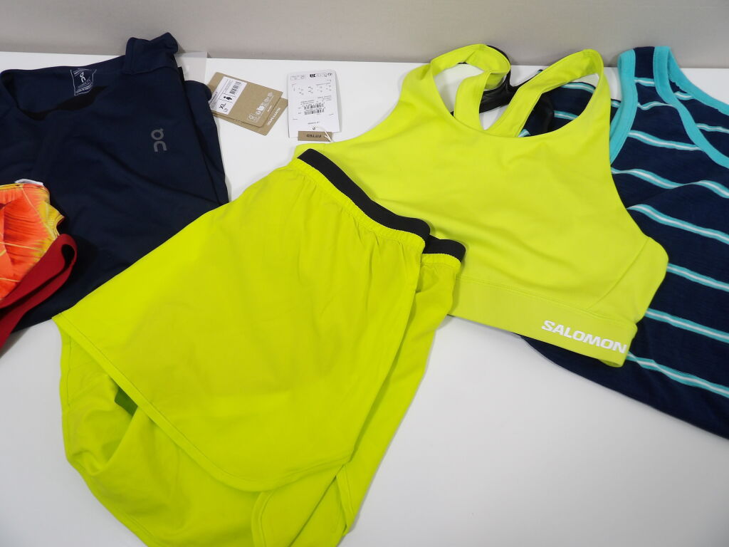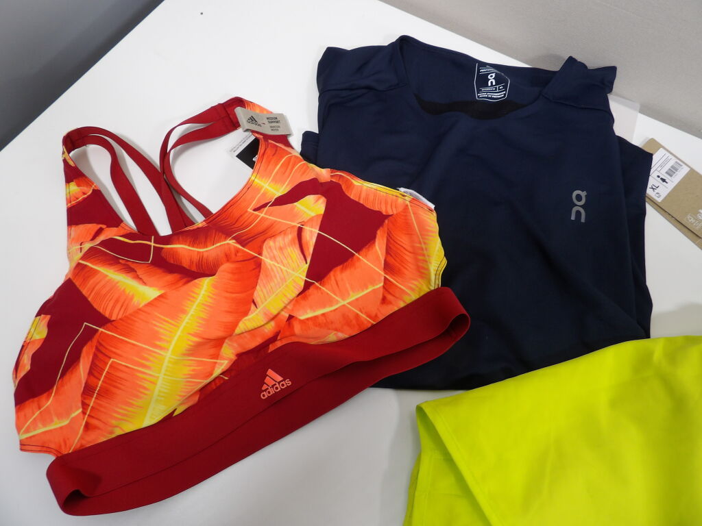 Lot de x5 vêtements SPORT Femme - neufs - en taille L et XL : SALOMON Short jaune et brassière jaune fluo, x1 Tshirt ON Swiss Engineering, x1 brassière Adidas (100B), x1 débardeur robe RUSTY.