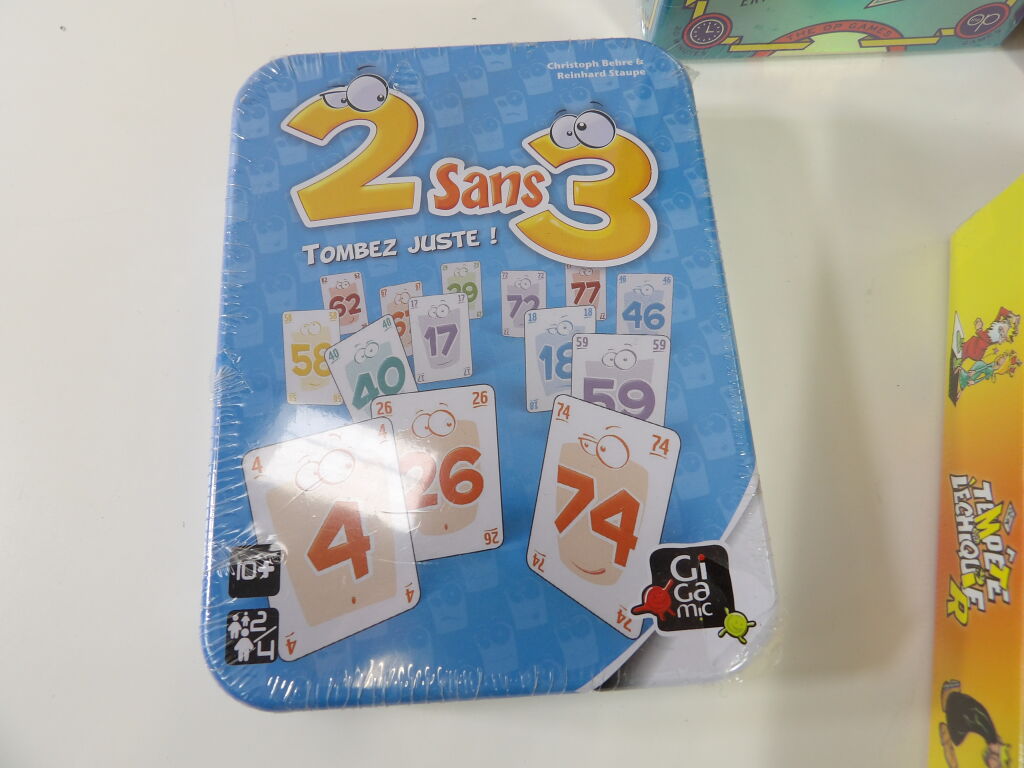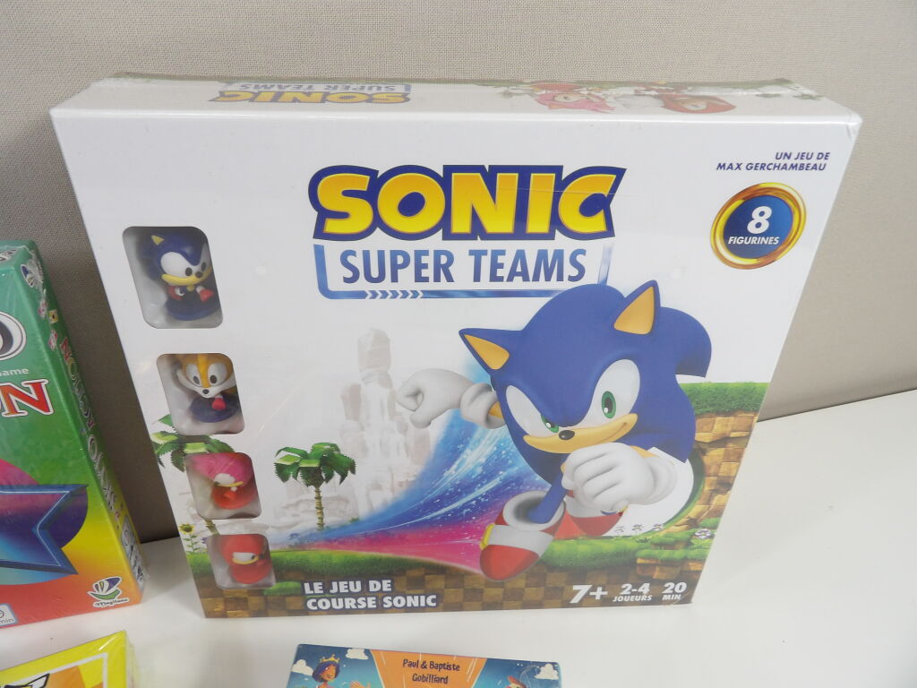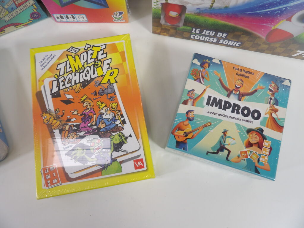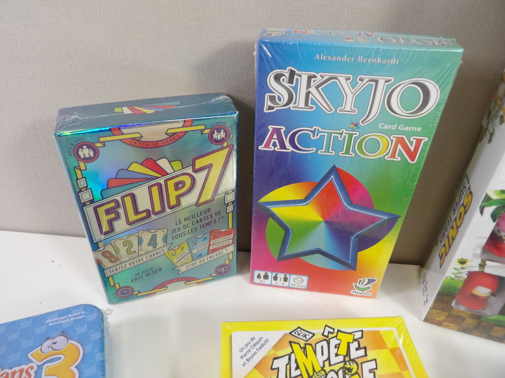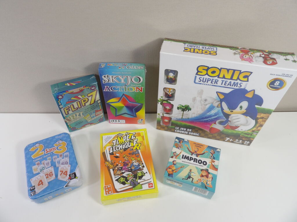 Lot de x6 jeux de société NEUFS (sous blister) pour grands et petits! SONIC Super Teams, SKYJO, IMPROO, 2 SANS 3, Tempête sur l'échiquier et FLIP7.