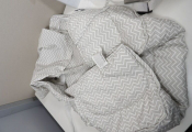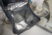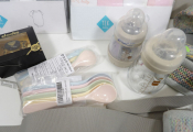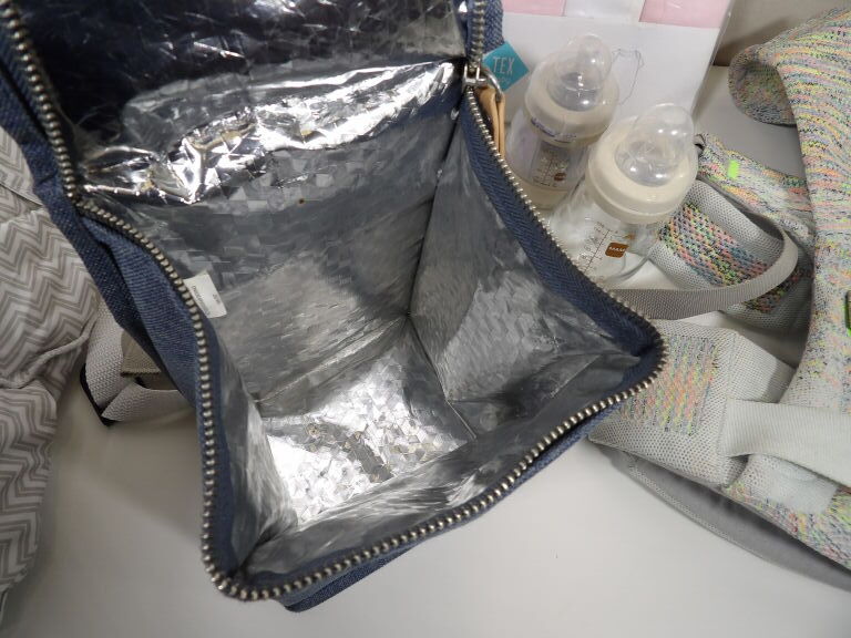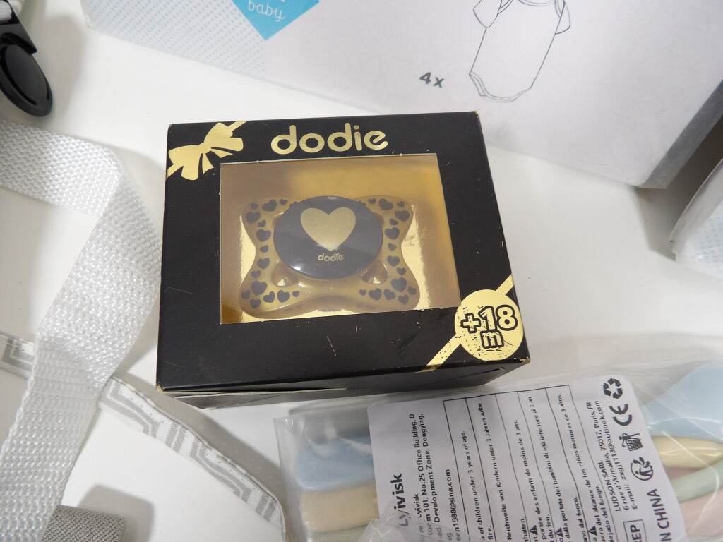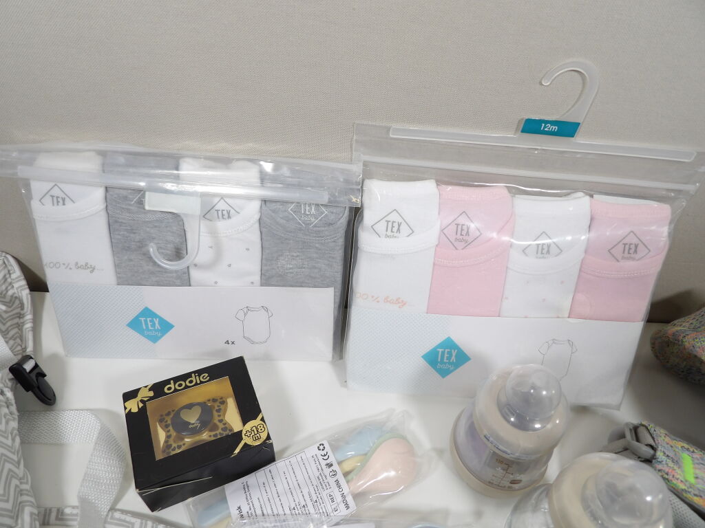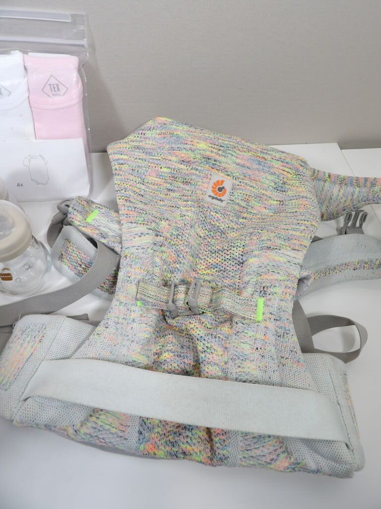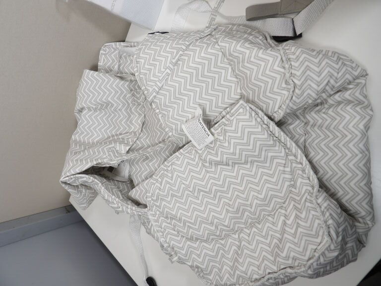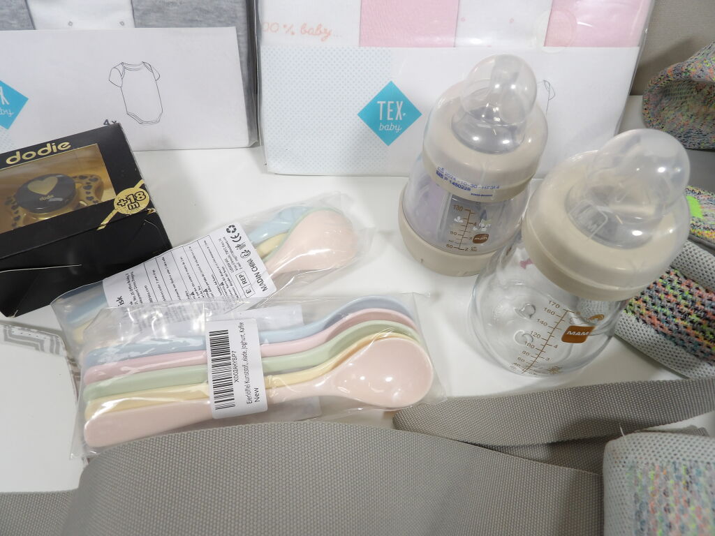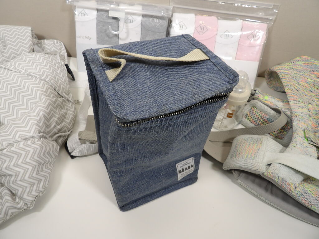 Lot de x9 articles pour BÉBÉ - BALLADE (neuf et occasion) : Porte bébé a mettre dans un cadie, d'occasion, et un porte bébé ERGOBABY les 2 sont d'occasion en état correct. On y inclut une petite pochette repas isotherme BEABA, des cuillères, deux biberons MAM (dont un en verre etat neuf), une tétine dodie +18m, et x2 packs de 4 bodies pour bébé 12M TEX baby.