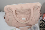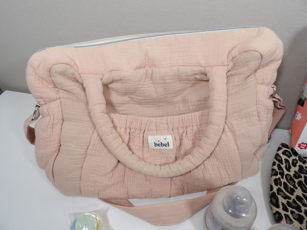 Lot de x9 articles pour BÉBÉ (neuf et occasion) : Sac à langer BEBEL en gaze de coton rose, d'occasion (état correct),