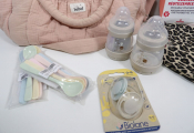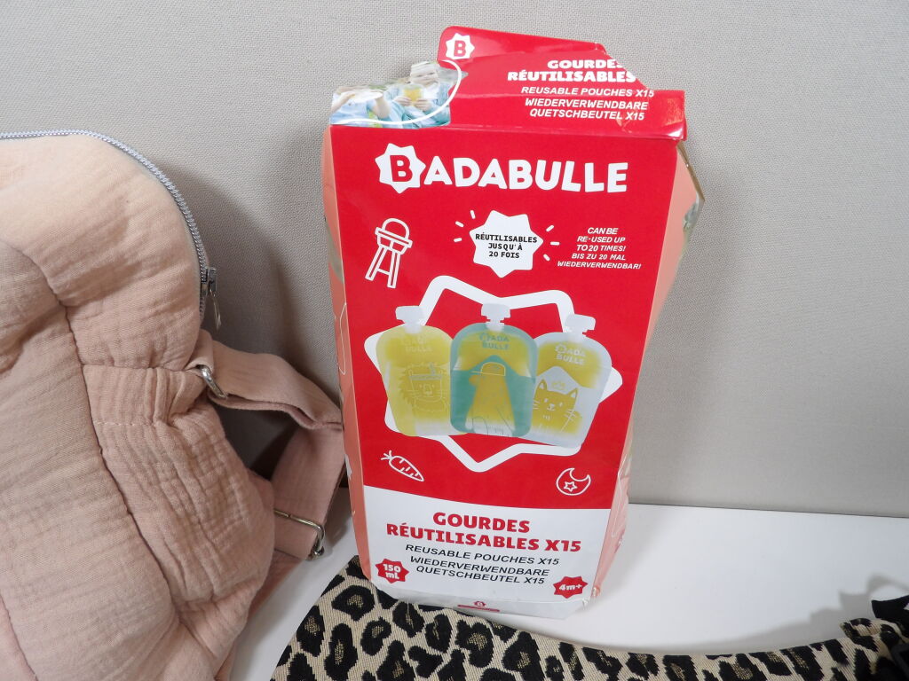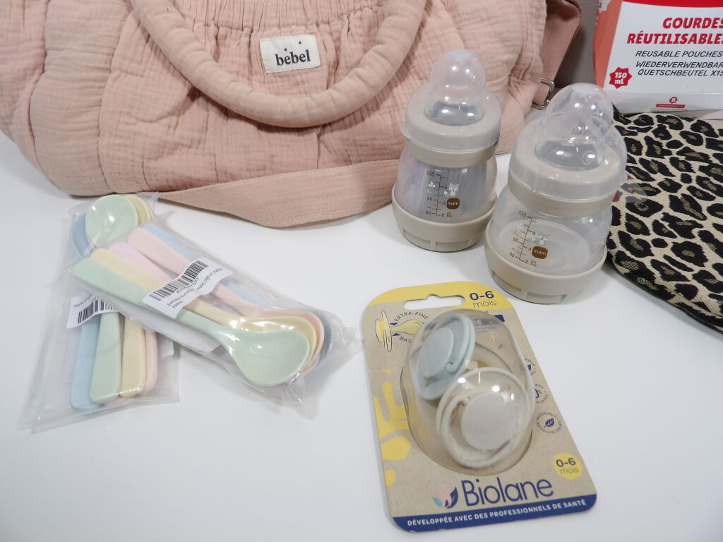 On y inclut des gourdes réutilisables BADABULLE (boite descellée), x2 biberons MAM de 130ML, x2 lots de cuillères (sans marque), x1 pack de tétine BIOLANE 0-6M, porte-bébé léopard (sans marque) et SOPHIE LA GIRAFE.