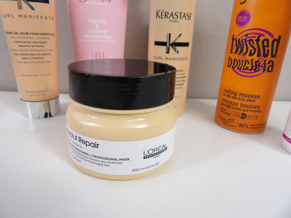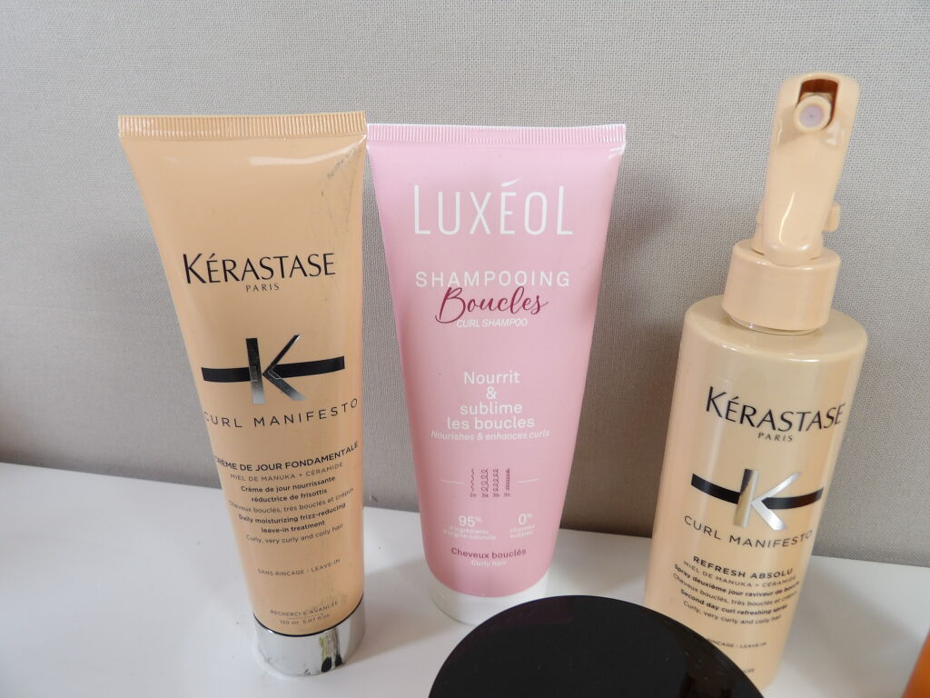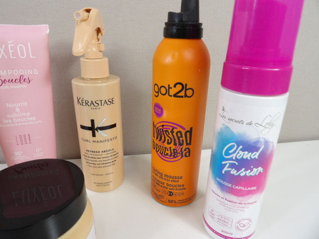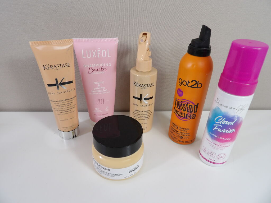 -Got2b mousse boucles 250ML (sans capuchon), LUXEOL Shampoing boucles 200ML, LES SECRETS DE LOLY Mousse capilaire de 200ML, KERASTASE Crème jour fondamentale pour boucles 150ML, CURL MANIFESTO de Kerastase 190ML et L'oréal masque absolut repair pour cheveux très secs 250 ML (descellé).