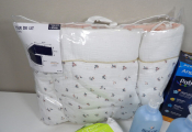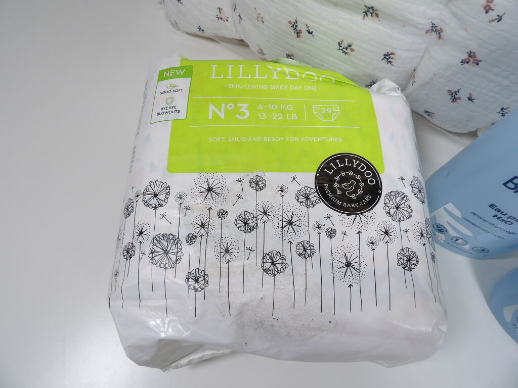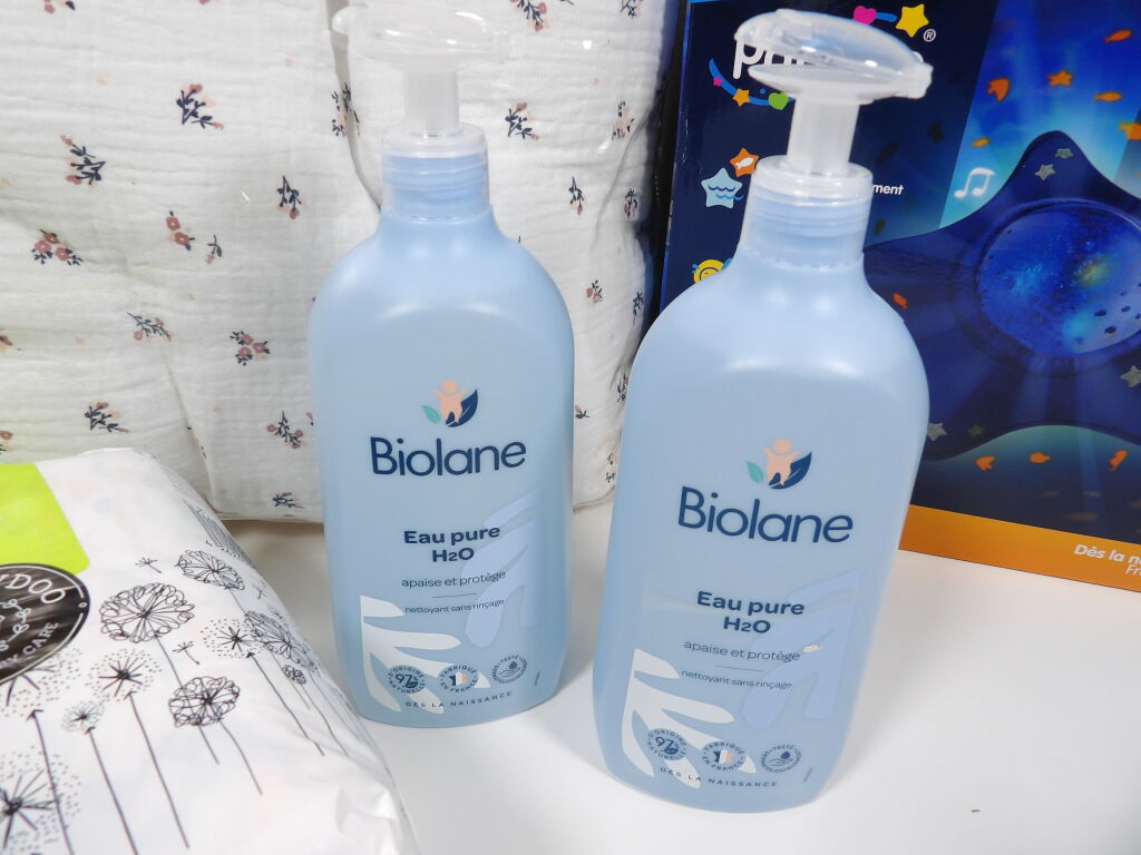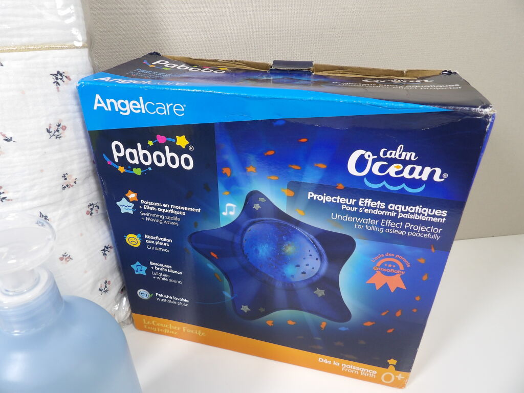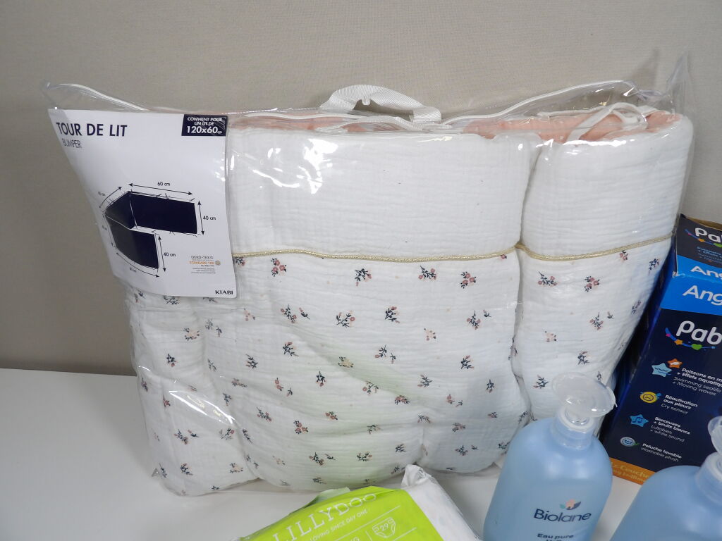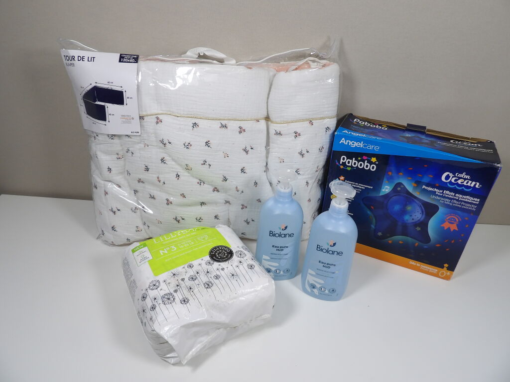 Lot SOMMEIL pour bébé x5 articles (neuf et occasion) : Veilleuse Angelcare PABOBO (boite descellée); Tour de lit (pour un lit de 120x60) KIABI - très bon état - un paquet de 29 couches LILLYDOO N°3 (6*10 kgs) et x2 Biolane Eau pure H20 de 750ML.