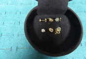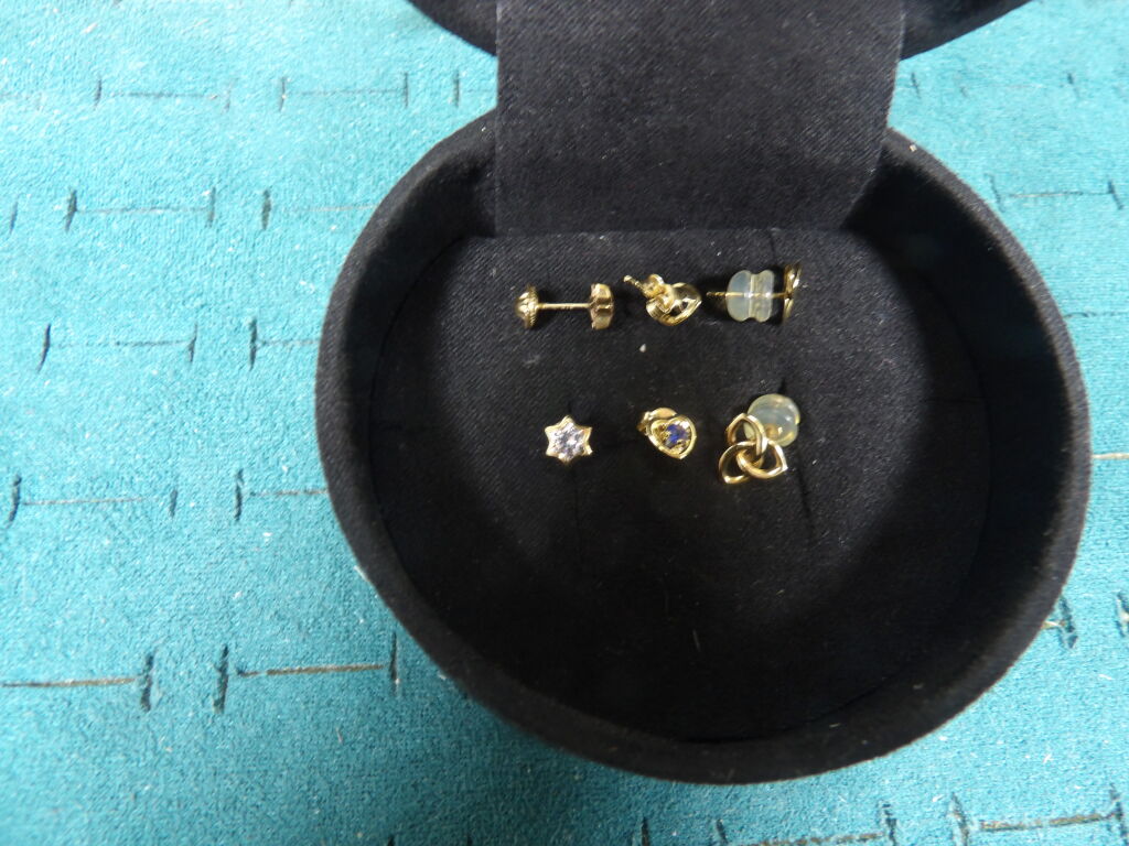 Or 9 carats : 3 paires de boucles d'oreille puces pierres bleues et pierres blanches poids brut : 1 g.