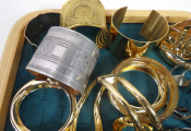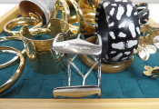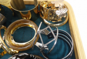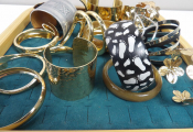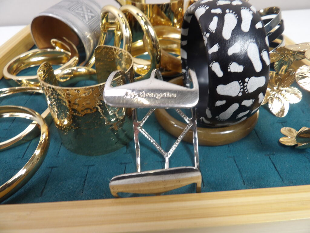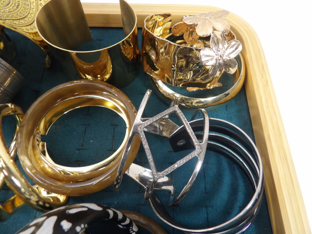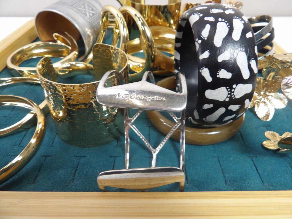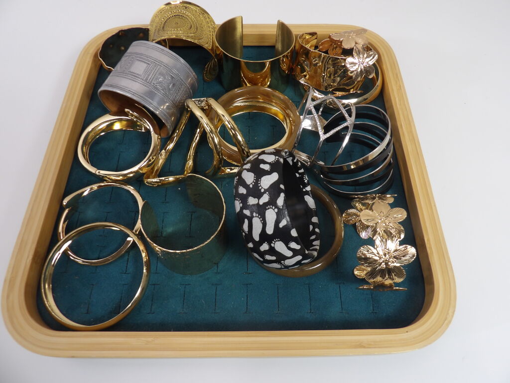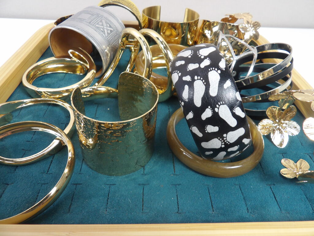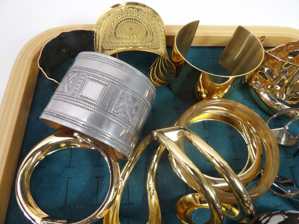 Vingtaine de bracelets et manchettes matières diverses, neuf et occasion, une manchette Les Georgettes (sans la languette intérieure)