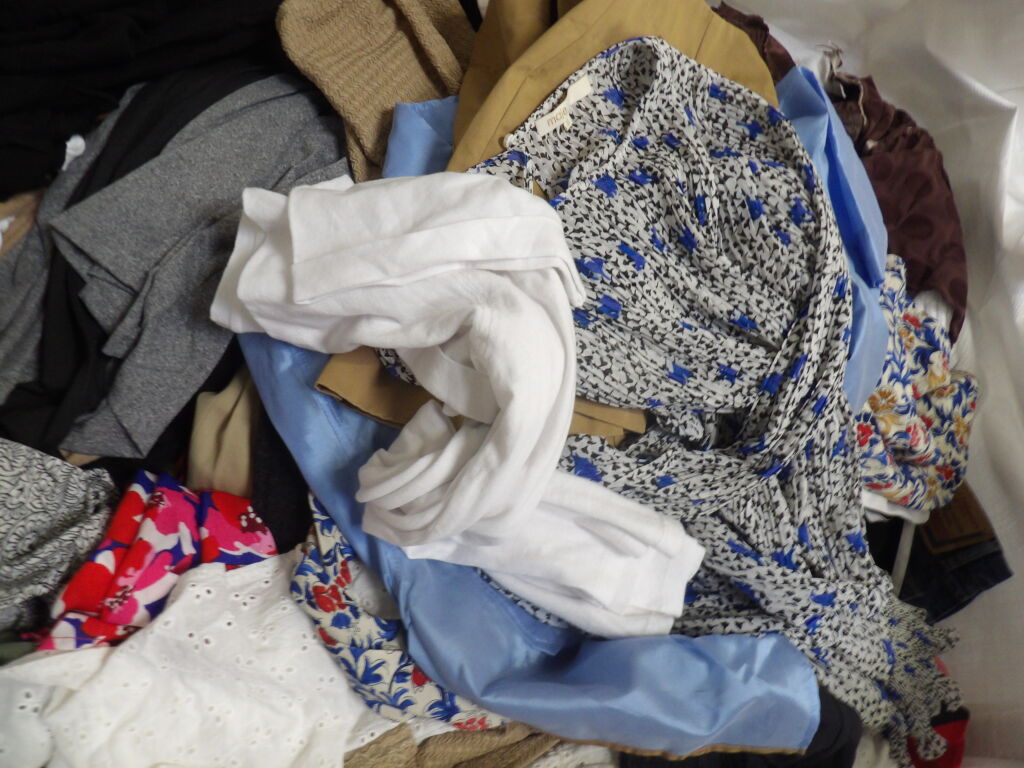 1 palette de 200 pièces de vêtements d'occasion et certains neufs : Femme, Enfant, Homme ( divers gammes et marques dont Maje, Sandro, Sézane...) - ATTENTION ce lot est d'occasion tous états et contient divers gammes donc de l'entrée type KIABI aussi. il n'est pas composé uniquement des marques citées.