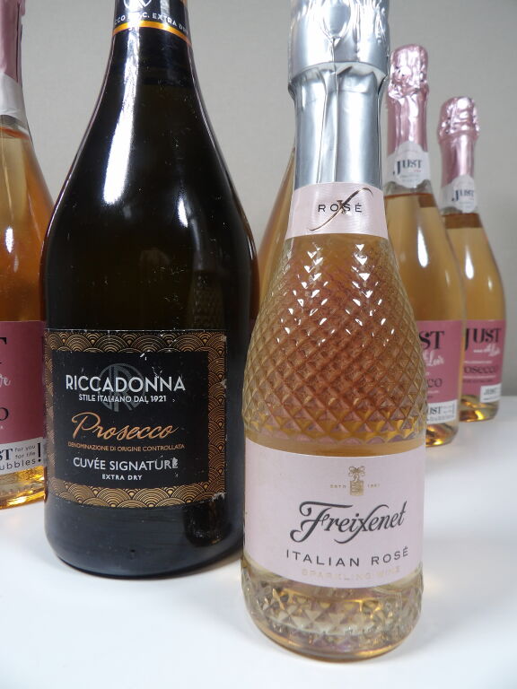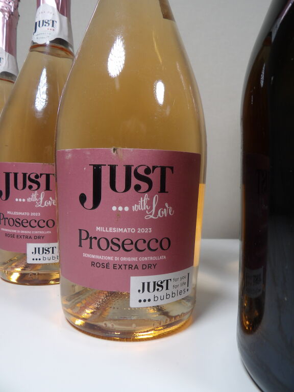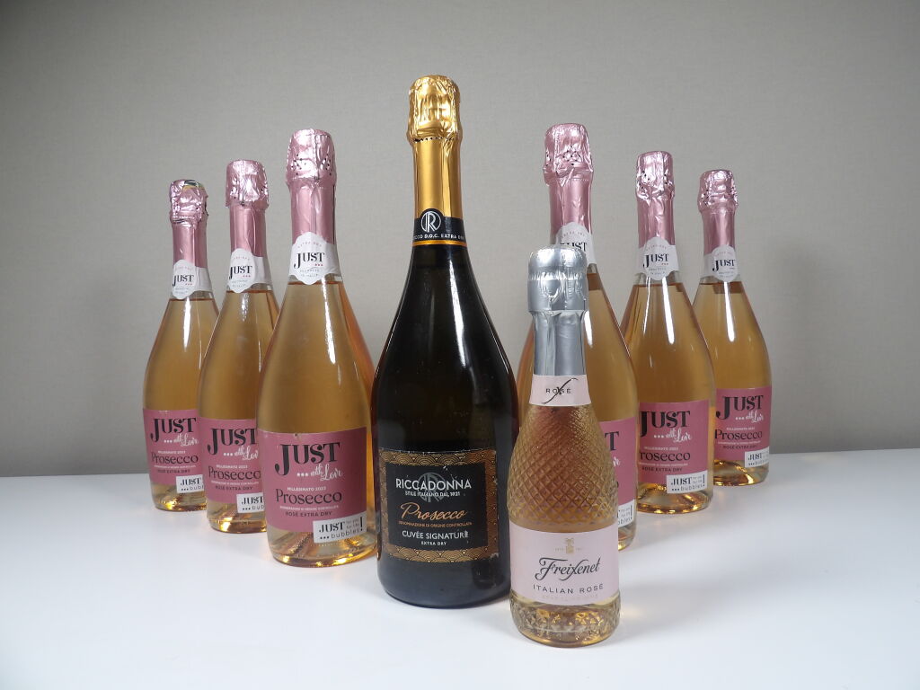 6 bouteilles de prosecco rosé Just with Love, une de prosecco blanc Riccadonna cuvée Signature on y joint une bouteille de 20 cl de Freixenet rosé