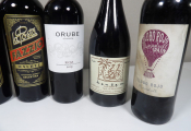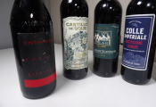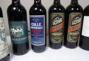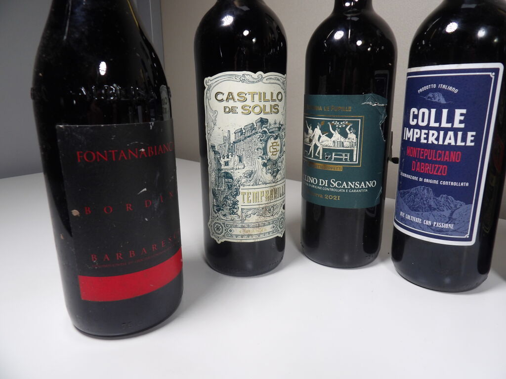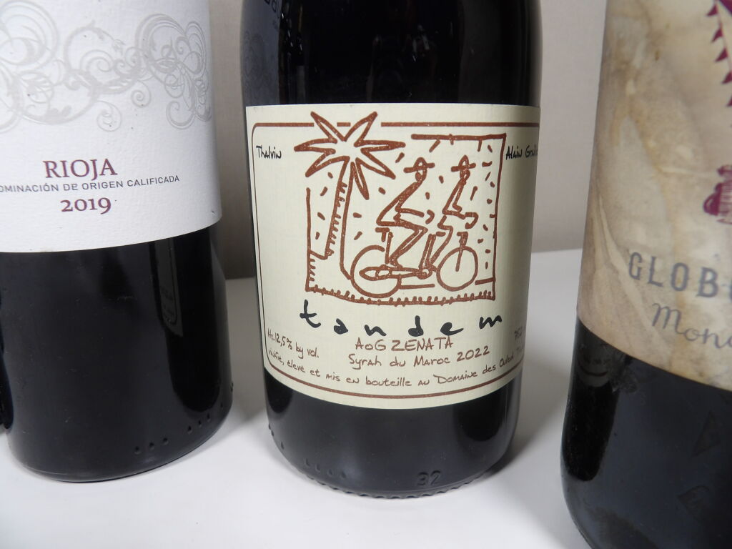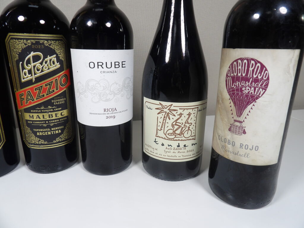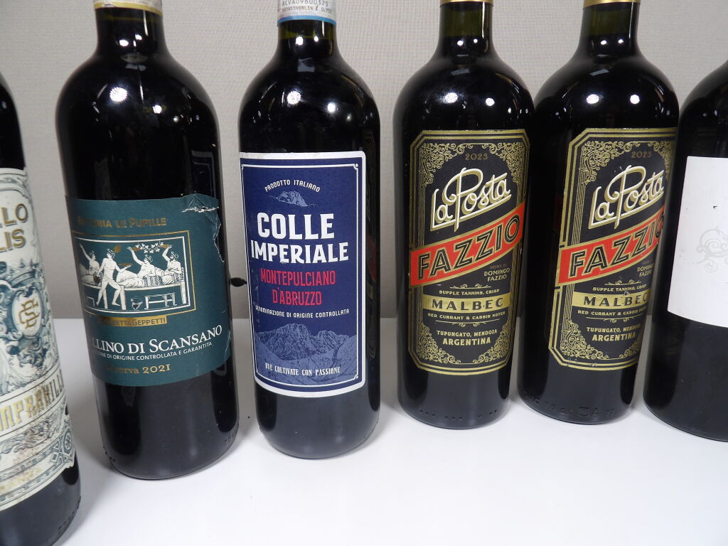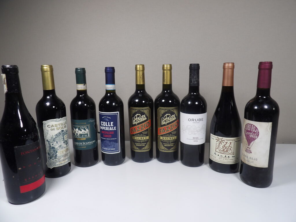 9 bouteilles de vins rouges étrangers (Italie, Espagne, Maroc, Argentine) (quelques étiquettes tâchées)