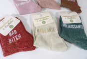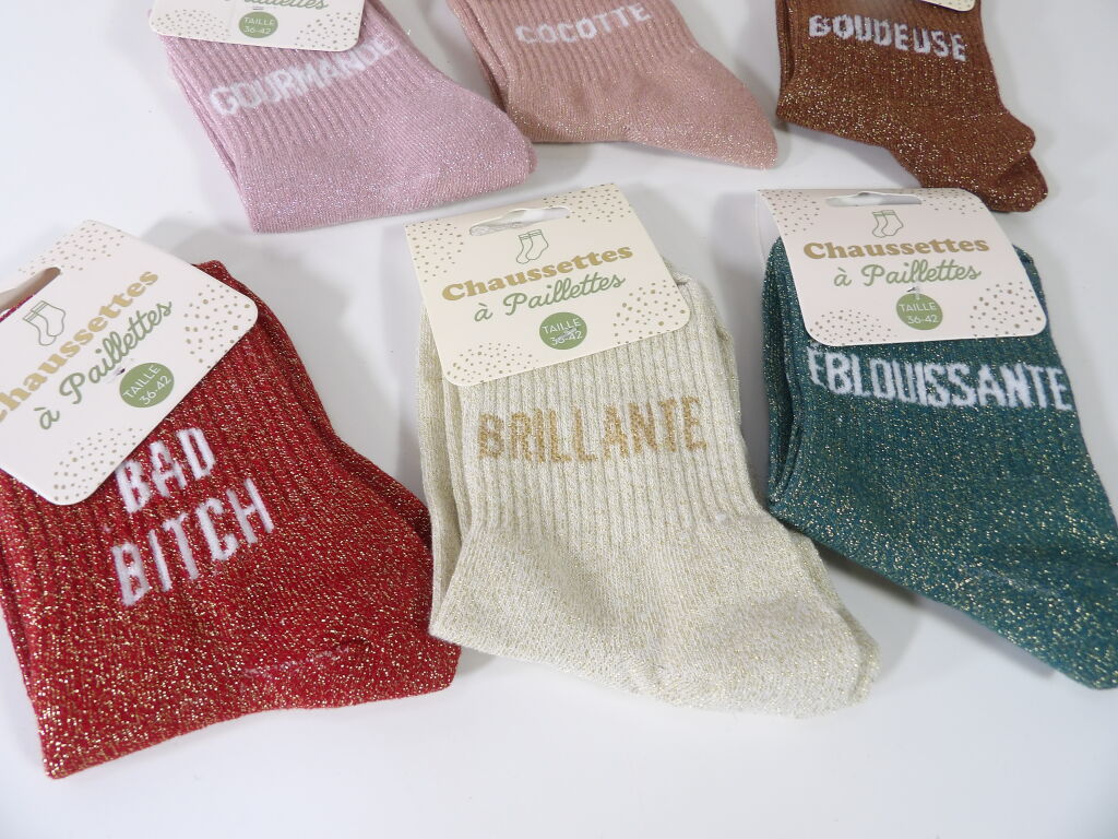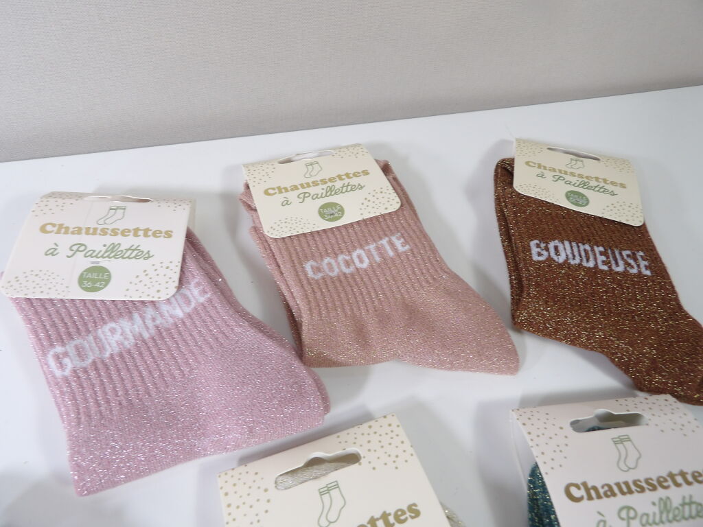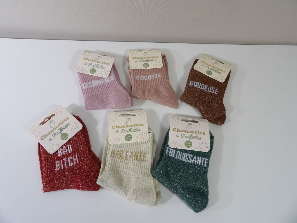 CHAUSSETTES à PAILLETTES Lot de x6 paires NEUVES avec petits mots : Cocotte, Gourmande, Eblouissante, Boudeuse, Brillante et Bad Bitch. Taille 36-42.